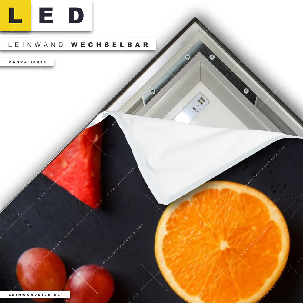 Du konfigurierst Dein individuelles LED Leinwandbild Canvalight® TEX | Früchte - Gesunde Ernährung | Schmal und wir produzieren es NEU für Dich. Unsere Essen - Trinken LED Bilder mit wechselbarer Textil-Leinwand sind KEINE Lagerware. Du bist Dir unsicher, welches Motiv oder Format das richtige für dein individuelles Canvalight® Leuchtbild ist, dann helfen wir dir gerne weiter und beraten dich!
