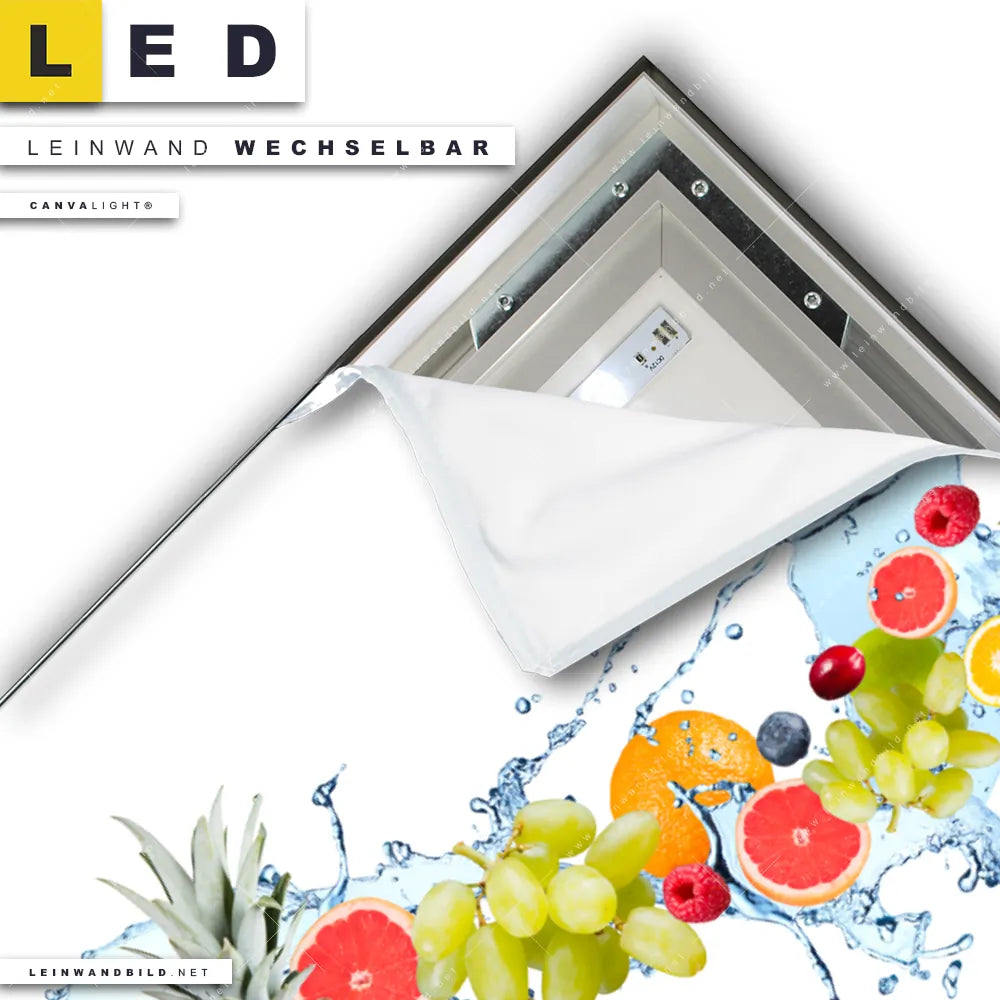 Du konfigurierst Dein individuelles LED Leinwandbild Canvalight® TEX | Früchte in Spritzwasser | Querformat und wir produzieren es NEU für Dich. Unsere Essen - Trinken LED Bilder mit wechselbarer Textil-Leinwand sind KEINE Lagerware. Du bist Dir unsicher, welches Motiv oder Format das richtige für dein individuelles Canvalight® Leuchtbild ist, dann helfen wir dir gerne weiter und beraten dich!