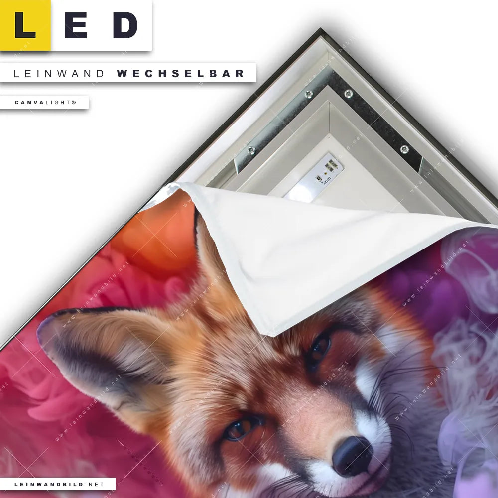 Du konfigurierst Dein individuelles LED Leinwandbild Canvalight® TEX | Fuchs in Farbnebel | Quadrat und wir produzieren es NEU für Dich. Unsere Tierwelt LED Bilder mit wechselbarer Textil-Leinwand sind KEINE Lagerware. Du bist Dir unsicher, welches Motiv oder Format das richtige für dein individuelles Canvalight® Leuchtbild ist, dann helfen wir dir gerne weiter und beraten dich!