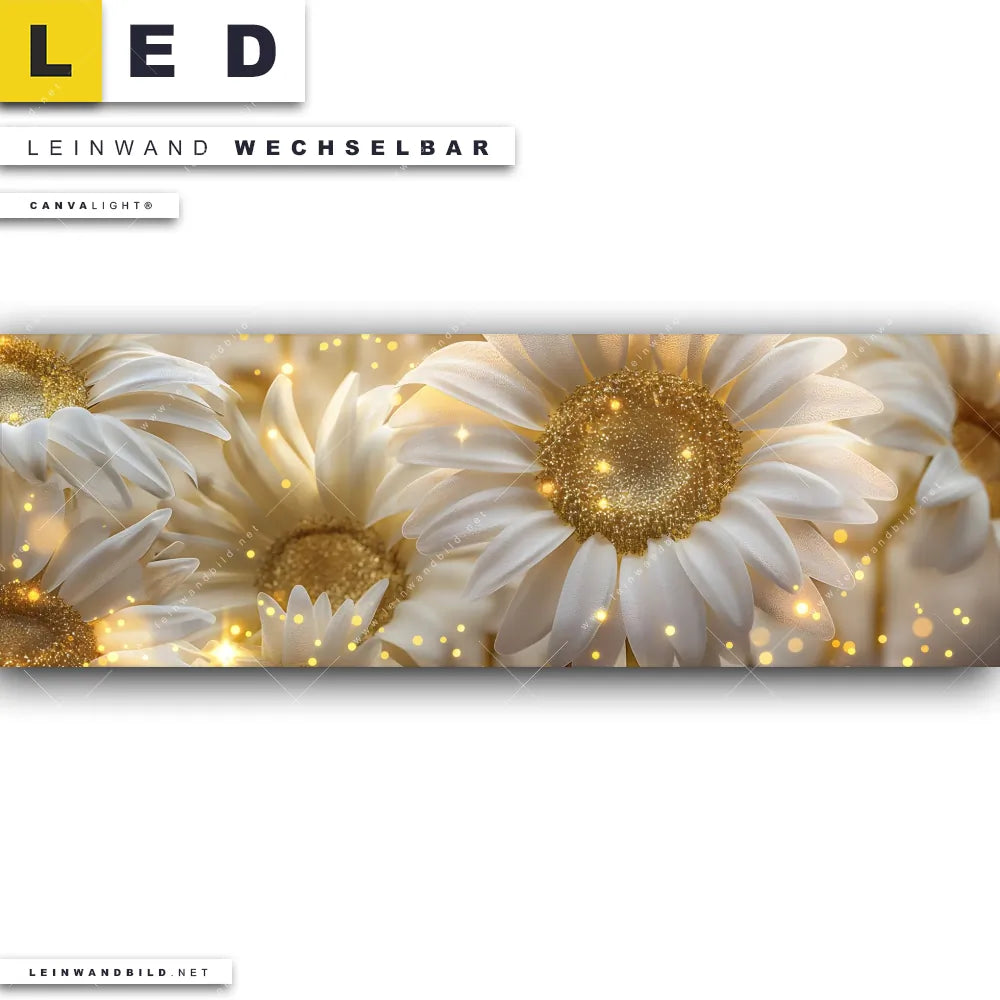 Du bist auf der Suche nach einem Blumen - Botanik LED Leinwandbild im Panorama-Format? Begriffe wie Gänseblümchen, Blüten, Natur, Pflanze, Glitzer, Blütenmeer haben Dich auf der Suche nach Deinem neuen XXL LED Wandbild mit wechselbarer Leinwand inspiriert? Farben wie Weiss, Gold dürfen auf Deinem neuen extra breiten Leinwand-LED-Bild nicht fehlen und Leuchtbilder im Floral, Modern Art Stil passen perfekt zu Deinem Einrichtungsstil?