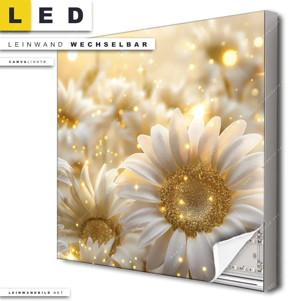 Du bist auf der Suche nach einem Blumen - Botanik LED Leinwandbild im Quadratischen Format? Begriffe wie Gänseblümchen, Blüten, Natur, Pflanze, Glitzer, Blütenmeer haben Dich auf der Suche nach Deinem neuen XXL LED Wandbild mit wechselbarer Leinwand inspiriert? Farben wie Weiss, Gold dürfen auf Deinem neuen Leinwand-LED-Bild nicht fehlen und Leuchtbilder im Floral, Modern Art Stil passen perfekt zu Deinem Einrichtungsstil?