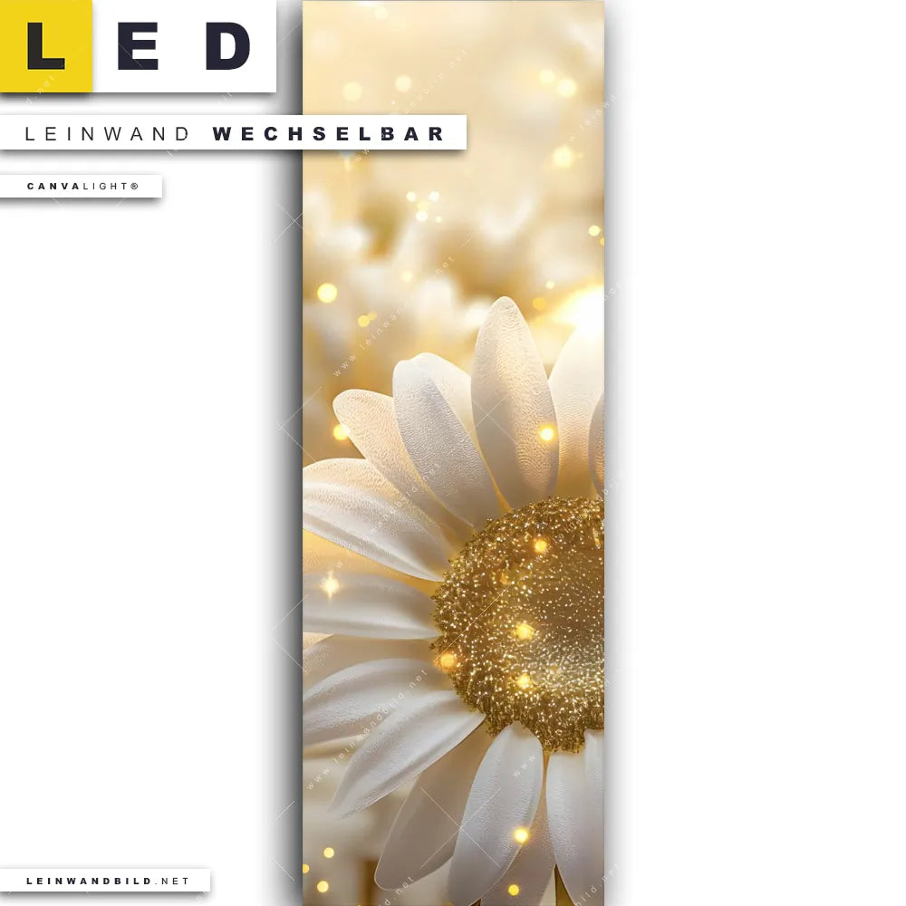 Du bist auf der Suche nach einem Blumen - Botanik LED Leinwandbild im Schmalen Format? Begriffe wie Gänseblümchen, Blüten, Natur, Pflanze, Glitzer, Blütenmeer haben Dich auf der Suche nach Deinem neuen XXL LED Wandbild mit wechselbarer Leinwand inspiriert? Farben wie Weiss, Gold dürfen auf Deinem neuen Leinwand-LED-Bild im Panorama-Hochformat nicht fehlen und Leuchtbilder im Floral, Modern Art Stil passen perfekt zu Deinem Einrichtungsstil?