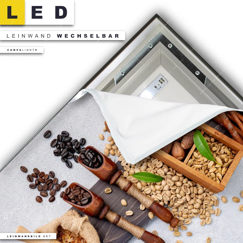 Du konfigurierst Dein individuelles LED Leinwandbild Canvalight® TEX | Geröstete Kaffeebohnen No.1 | Quadrat und wir produzieren es NEU für Dich. Unsere Essen - Trinken LED Bilder mit wechselbarer Textil-Leinwand sind KEINE Lagerware. Du bist Dir unsicher, welches Motiv oder Format das richtige für dein individuelles Canvalight® Leuchtbild ist, dann helfen wir dir gerne weiter und beraten dich!