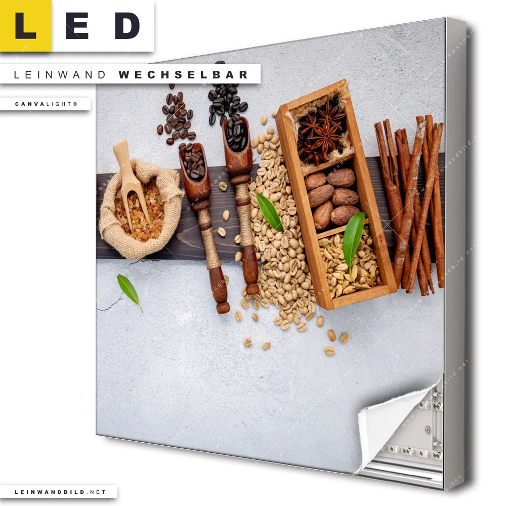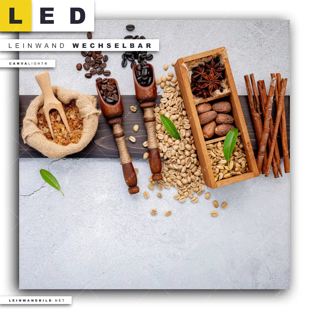 Du bist auf der Suche nach einem Essen - Trinken LED Leinwandbild im Quadratischen Format? Begriffe wie Kaffee, Coffee, Küche, Kaffebohnen, Bohne, Genuss, Aroma, Brauner Zucker, Zimtstangen, Sternanis, Holzbrett haben Dich auf der Suche nach Deinem neuen XXL LED Wandbild mit wechselbarer Leinwand inspiriert? Farben wie Braun, Beige, Grün dürfen auf Deinem neuen Leinwand-LED-Bild nicht fehlen und Leuchtbilder im Minimalistisch, Modern Art Stil passen perfekt zu Deinem Einrichtungsstil?