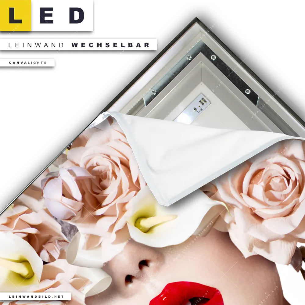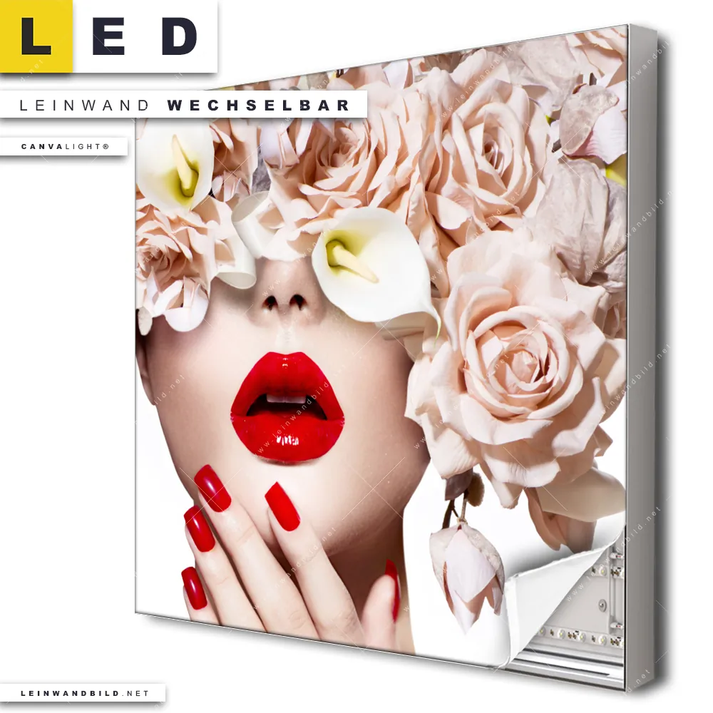 Du bist auf der Suche nach einem Porträts - Menschen, Blumen - Botanik LED Leinwandbild im Quadratischen Format? Begriffe wie Menschen & Blumen, Frau, Porträt, modern, Beauty, Gesicht, Blumen, Blüten, Schönheit, Mode, Lippen haben Dich auf der Suche nach Deinem neuen XXL LED Wandbild mit wechselbarer Leinwand inspiriert? Farben wie Beige, Weiss, Rot dürfen auf Deinem neuen Leinwand-LED-Bild nicht fehlen und Leuchtbilder im Modern Art, Floral Stil passen perfekt zu Deinem Einrichtungsstil?
