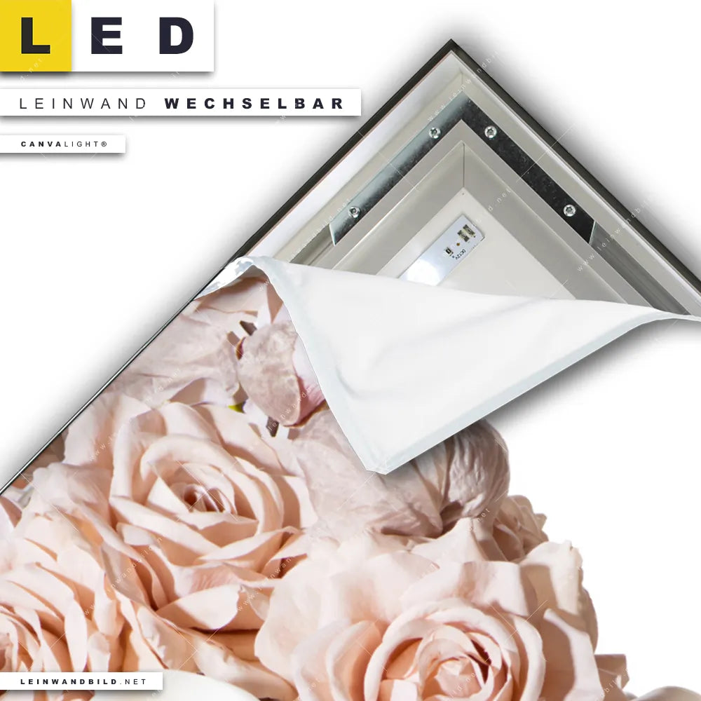 Du konfigurierst Dein individuelles LED Leinwandbild Canvalight® TEX | Gesicht & Rosen | Querformat und wir produzieren es NEU für Dich. Unsere Porträts - Menschen, Blumen - Botanik LED Bilder mit wechselbarer Textil-Leinwand sind KEINE Lagerware. Du bist Dir unsicher, welches Motiv oder Format das richtige für dein individuelles Canvalight® Leuchtbild ist, dann helfen wir dir gerne weiter und beraten dich!