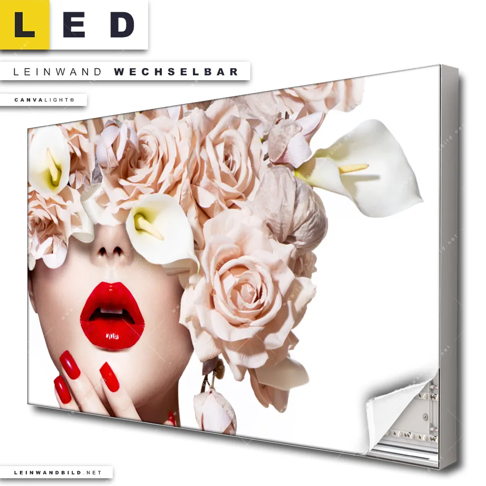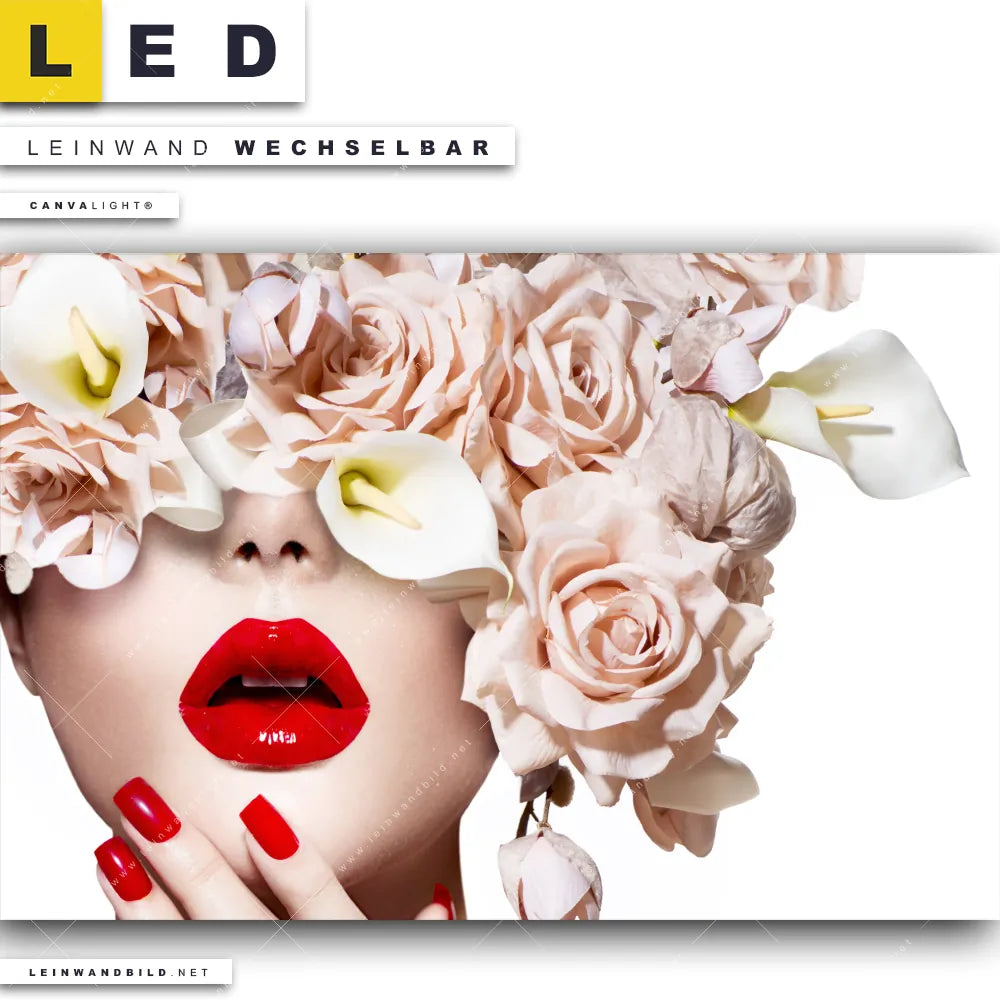 Du bist auf der Suche nach einem Porträts - Menschen, Blumen - Botanik LED Leinwandbild im Querformat? Begriffe wie Menschen & Blumen, Frau, Porträt, modern, Beauty, Gesicht, Blumen, Blüten, Schönheit, Mode, Lippen haben Dich auf der Suche nach Deinem neuen XXL LED Wandbild mit wechselbarer Leinwand inspiriert? Farben wie Beige, Weiss, Rot dürfen auf Deinem neuen breiten Leinwand-LED-Bild nicht fehlen und Leuchtbilder im Modern Art, Floral Stil passen perfekt zu Deinem Einrichtungsstil?