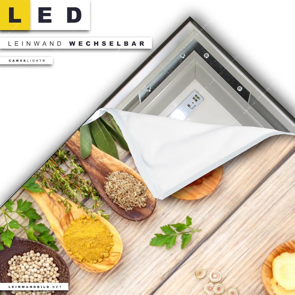 Du konfigurierst Dein individuelles LED Leinwandbild Canvalight® TEX | Gewürze auf hölzernen Löffeln | Querformat und wir produzieren es NEU für Dich. Unsere Essen - Trinken LED Bilder mit wechselbarer Textil-Leinwand sind KEINE Lagerware. Du bist Dir unsicher, welches Motiv oder Format das richtige für dein individuelles Canvalight® Leuchtbild ist, dann helfen wir dir gerne weiter und beraten dich!
