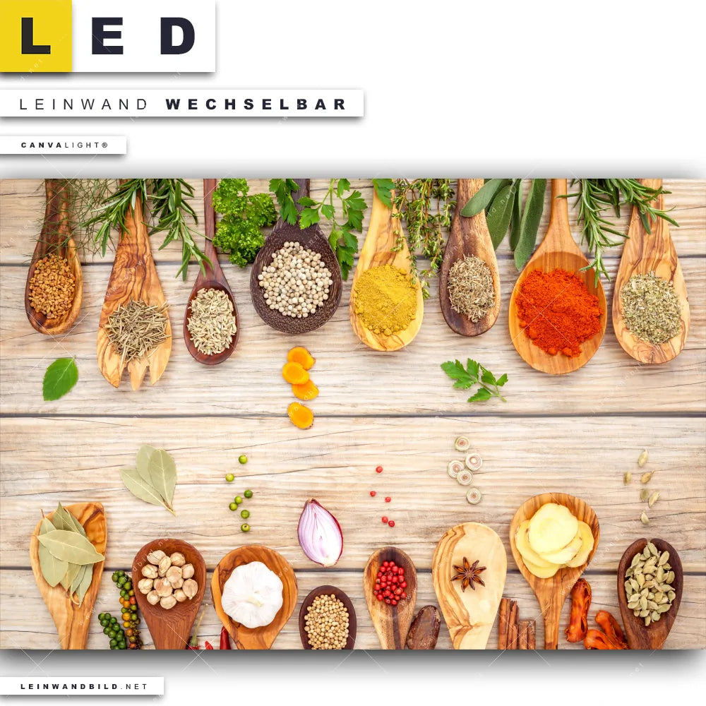 Du bist auf der Suche nach einem Essen - Trinken LED Leinwandbild im Querformat? Begriffe wie Gewürze, Kräuter, Löffel, kochen, Pfeffer, Curry, Holzlöffel, Küche, Lebensmittel, gesund, Holz, Brett haben Dich auf der Suche nach Deinem neuen XXL LED Wandbild mit wechselbarer Leinwand inspiriert? Farben wie Braun, Bunt, Beige dürfen auf Deinem neuen breiten Leinwand-LED-Bild nicht fehlen und Leuchtbilder im Modern Art, Natürlich - Realistisch Stil passen perfekt zu Deinem Einrichtungsstil?