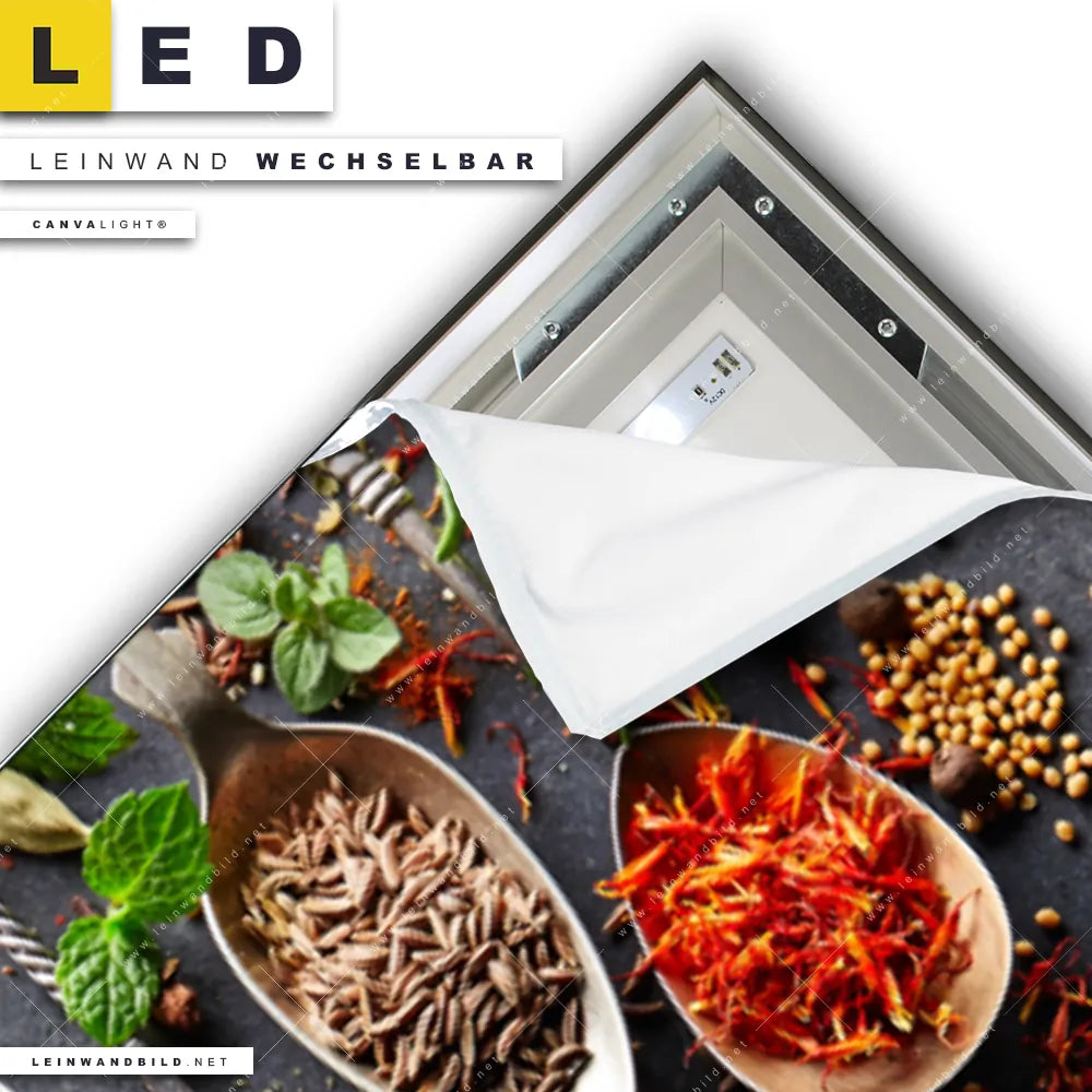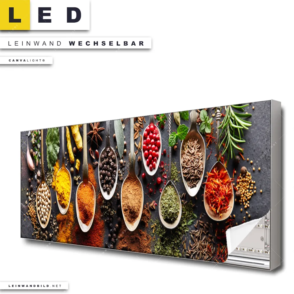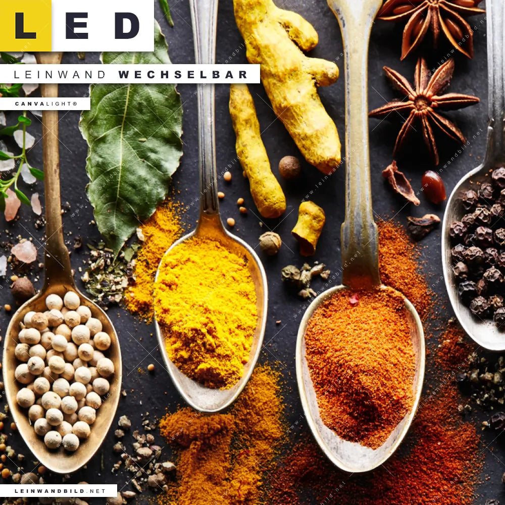 Du bist auf der Suche nach einem Essen - Trinken LED Leinwandbild im Panorama-Format? Begriffe wie Gewürze, Kräuter, Löffel, kochen, Pfeffer, Curry haben Dich auf der Suche nach Deinem neuen XXL LED Wandbild mit wechselbarer Leinwand inspiriert? Farben wie Bunt, Schwarz dürfen auf Deinem neuen extra breiten Leinwand-LED-Bild nicht fehlen und Leuchtbilder im Modern Art, Natürlich - Realistisch Stil passen perfekt zu Deinem Einrichtungsstil?