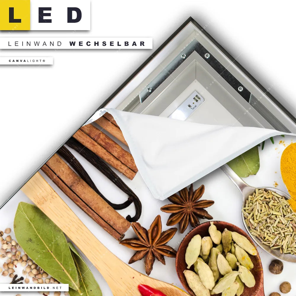 Du konfigurierst Dein individuelles LED Leinwandbild Canvalight® TEX | Gewürze auf Löffeln - weiß | Quadrat und wir produzieren es NEU für Dich. Unsere Essen - Trinken LED Bilder mit wechselbarer Textil-Leinwand sind KEINE Lagerware. Du bist Dir unsicher, welches Motiv oder Format das richtige für dein individuelles Canvalight® Leuchtbild ist, dann helfen wir dir gerne weiter und beraten dich!