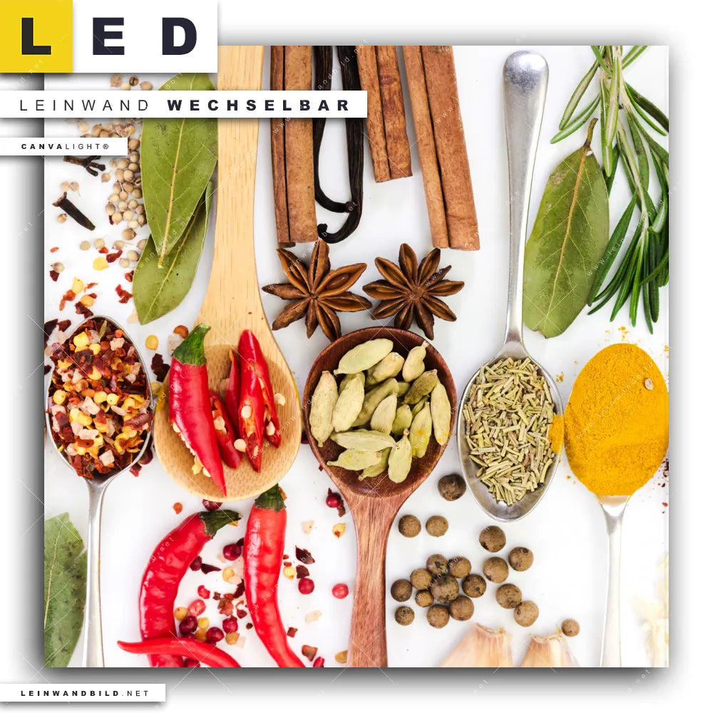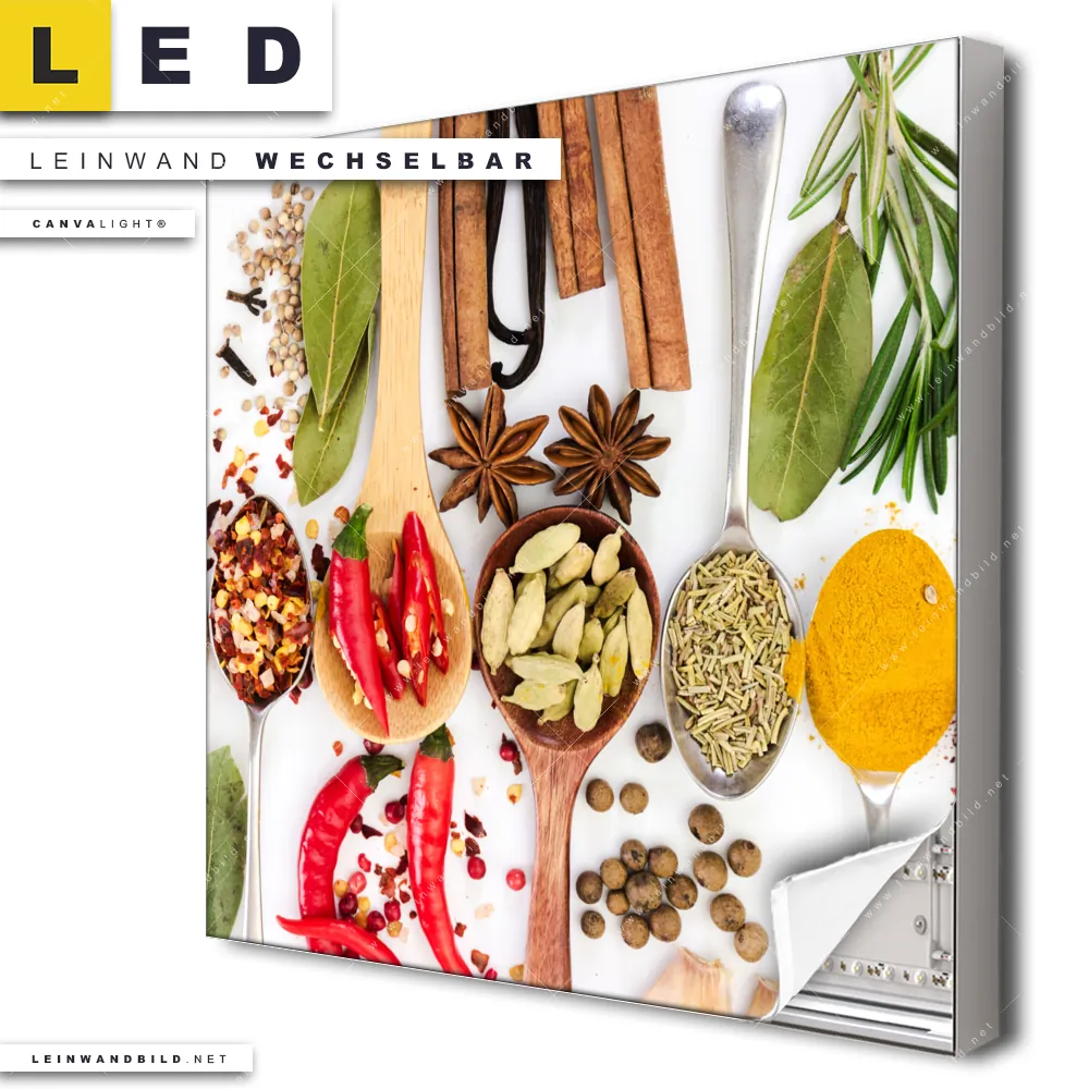 Du bist auf der Suche nach einem Essen - Trinken LED Leinwandbild im Quadratischen Format? Begriffe wie Gewürze, Kräuter, Löffel, kochen, Pfeffer, Salz, Curry, Chili haben Dich auf der Suche nach Deinem neuen XXL LED Wandbild mit wechselbarer Leinwand inspiriert? Farben wie Bunt, Schwarz dürfen auf Deinem neuen Leinwand-LED-Bild nicht fehlen und Leuchtbilder im Modern Art, Natürlich - Realistisch Stil passen perfekt zu Deinem Einrichtungsstil?