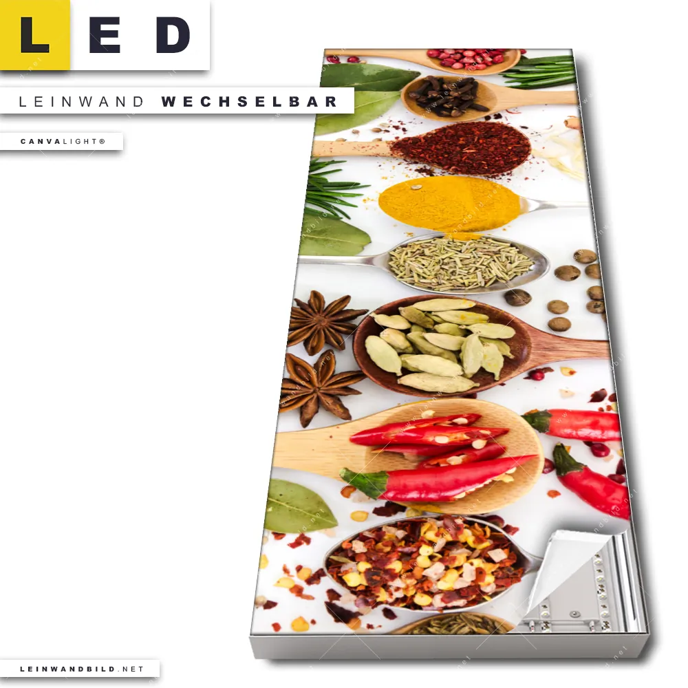 Du bist auf der Suche nach einem Essen - Trinken LED Leinwandbild im Schmalen Format? Begriffe wie Gewürze, Kräuter, Löffel, kochen, Pfeffer, Salz, Curry, Chili haben Dich auf der Suche nach Deinem neuen XXL LED Wandbild mit wechselbarer Leinwand inspiriert? Farben wie Bunt, Schwarz dürfen auf Deinem neuen Leinwand-LED-Bild im Panorama-Hochformat nicht fehlen und Leuchtbilder im Modern Art, Natürlich - Realistisch Stil passen perfekt zu Deinem Einrichtungsstil?