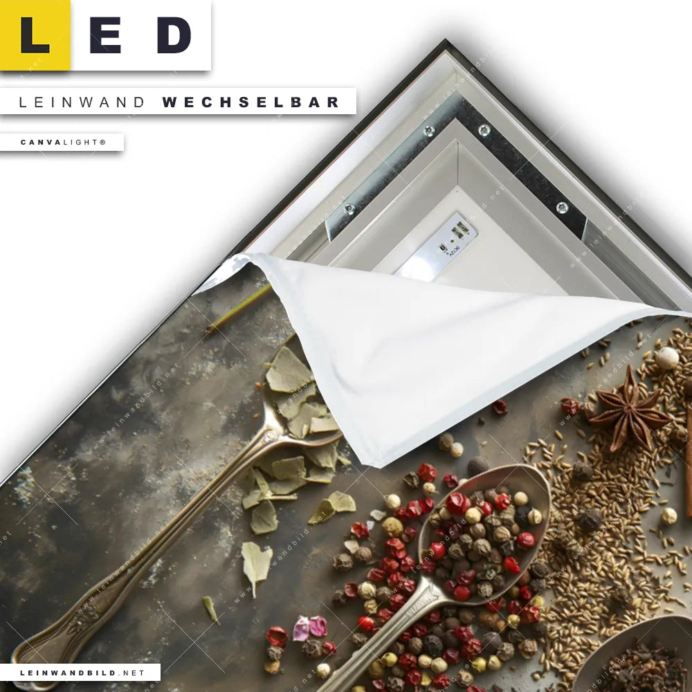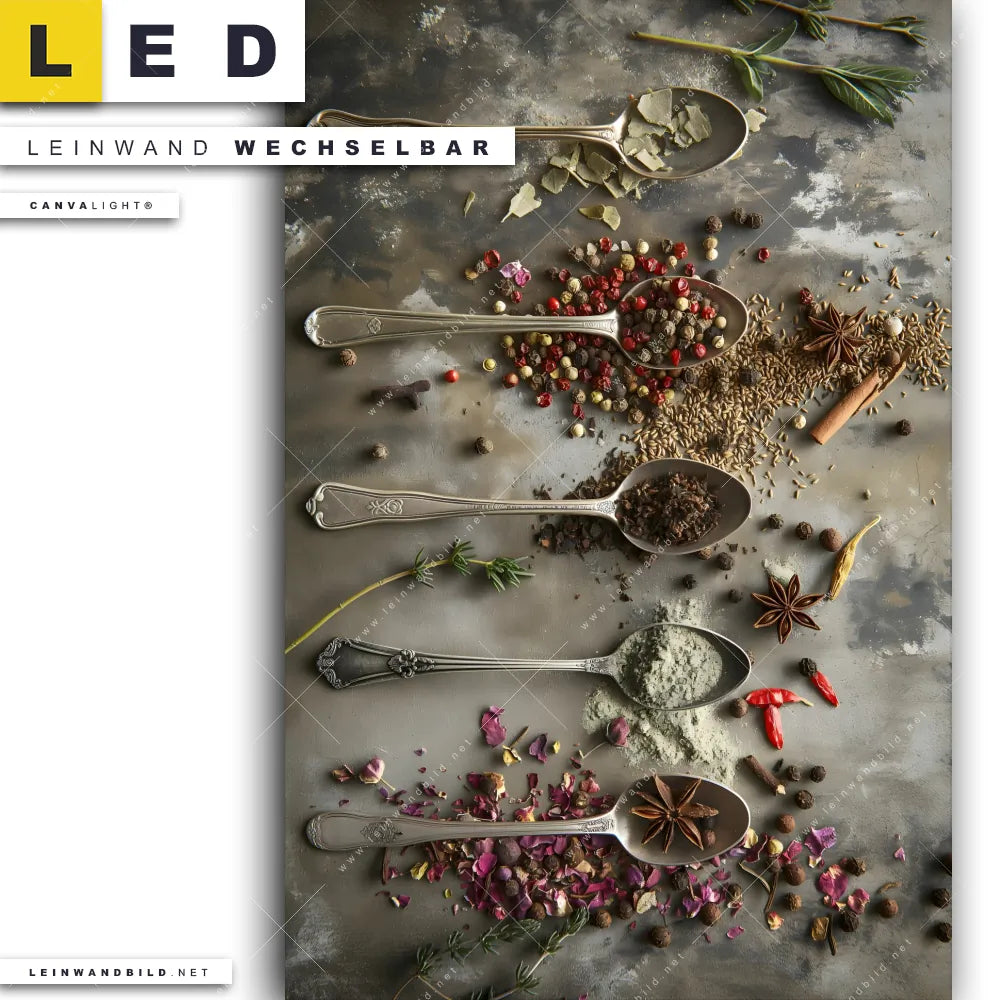 Du bist auf der Suche nach einem Essen - Trinken LED Leinwandbild im Hochformat? Begriffe wie Löffel, Besteck, Kräuter, Gewürze, kochen, Zutaten, Lebensmittel, Geschmack, Aromen, Pfeffer haben Dich auf der Suche nach Deinem neuen XXL LED Wandbild mit wechselbarer Leinwand inspiriert? Farben wie Silber, Grau , Braun dürfen auf Deinem neuen Leinwand-LED-Bild nicht fehlen und Leuchtbilder im Natürlich - Realistisch Stil passen perfekt zu Deinem Einrichtungsstil?