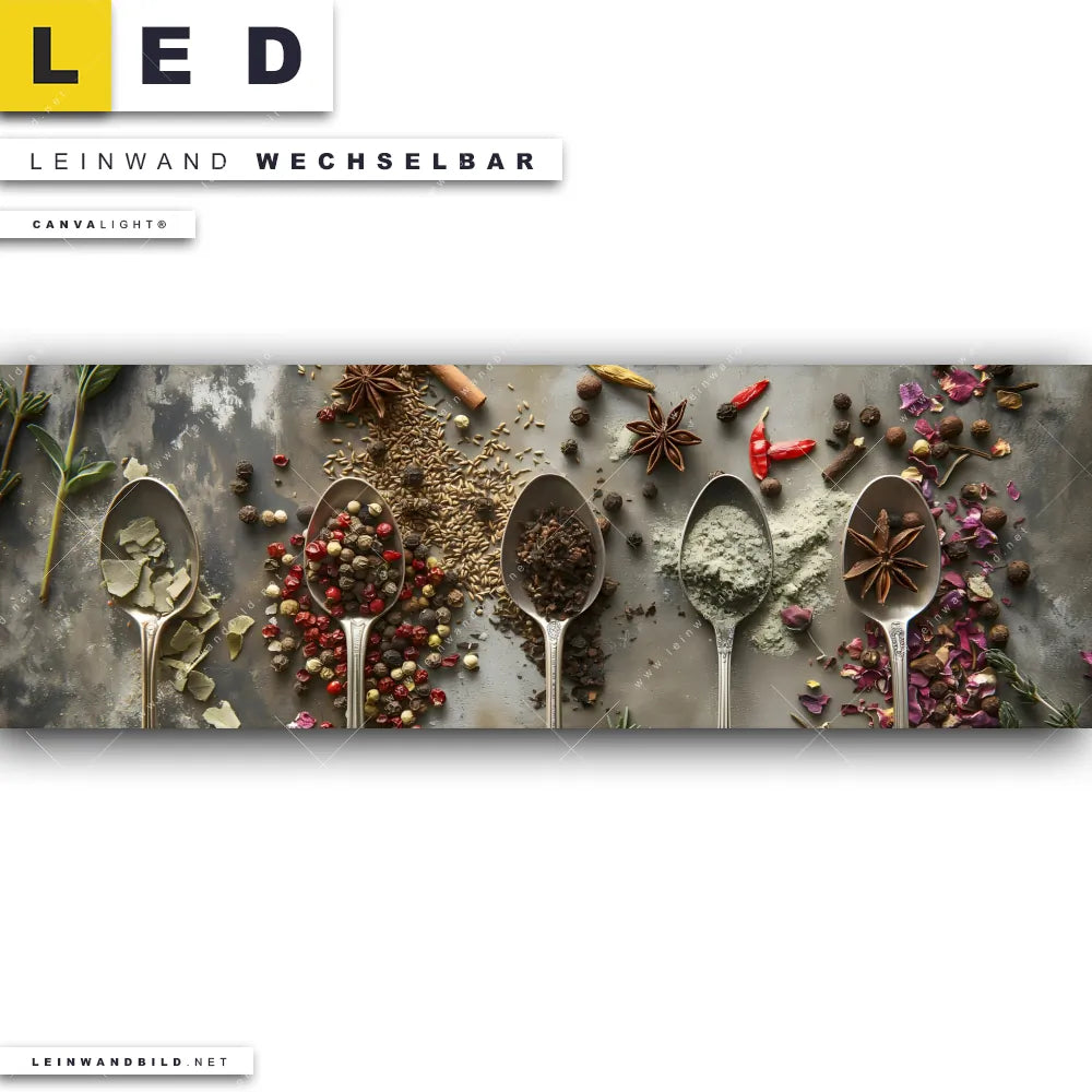 Du bist auf der Suche nach einem Essen - Trinken LED Leinwandbild im Panorama-Format? Begriffe wie Löffel, Besteck, Kräuter, Gewürze, kochen, Zutaten, Lebensmittel, Geschmack, Aromen, Pfeffer haben Dich auf der Suche nach Deinem neuen XXL LED Wandbild mit wechselbarer Leinwand inspiriert? Farben wie Silber, Grau , Braun dürfen auf Deinem neuen extra breiten Leinwand-LED-Bild nicht fehlen und Leuchtbilder im Natürlich - Realistisch Stil passen perfekt zu Deinem Einrichtungsstil?
