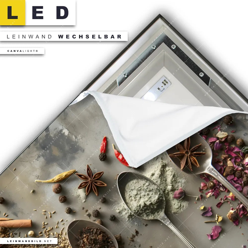 Du konfigurierst Dein individuelles LED Leinwandbild Canvalight® TEX | Gewürze der Welt | Querformat und wir produzieren es NEU für Dich. Unsere Essen - Trinken LED Bilder mit wechselbarer Textil-Leinwand sind KEINE Lagerware. Du bist Dir unsicher, welches Motiv oder Format das richtige für dein individuelles Canvalight® Leuchtbild ist, dann helfen wir dir gerne weiter und beraten dich!