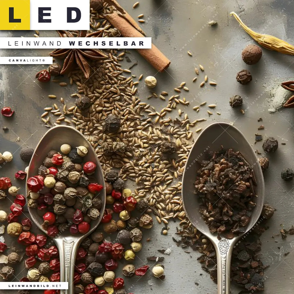 Du bist auf der Suche nach einem Essen - Trinken LED Leinwandbild im Querformat? Begriffe wie Löffel, Besteck, Kräuter, Gewürze, kochen, Zutaten, Lebensmittel, Geschmack, Aromen, Pfeffer haben Dich auf der Suche nach Deinem neuen XXL LED Wandbild mit wechselbarer Leinwand inspiriert? Farben wie Silber, Grau , Braun dürfen auf Deinem neuen breiten Leinwand-LED-Bild nicht fehlen und Leuchtbilder im Natürlich - Realistisch Stil passen perfekt zu Deinem Einrichtungsstil?