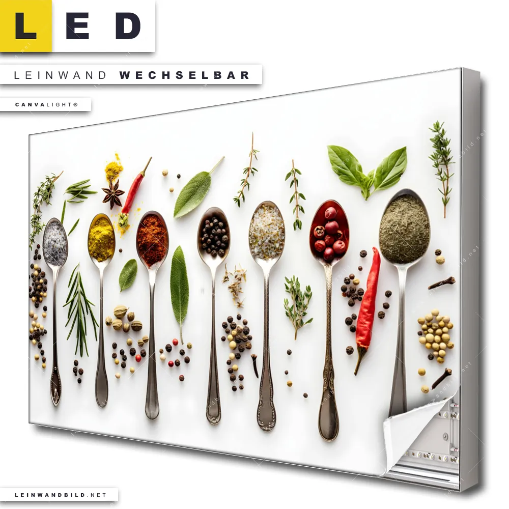 Du bist auf der Suche nach einem Essen - Trinken LED Leinwandbild im Querformat? Begriffe wie Gewürze, Kräuter, Löffel, Besteck, Lebensmittel, Geschmack, kochen, Aromen haben Dich auf der Suche nach Deinem neuen XXL LED Wandbild mit wechselbarer Leinwand inspiriert? Farben wie Weiss, Silber, Grün dürfen auf Deinem neuen breiten Leinwand-LED-Bild nicht fehlen und Leuchtbilder im Natürlich - Realistisch Stil passen perfekt zu Deinem Einrichtungsstil?
