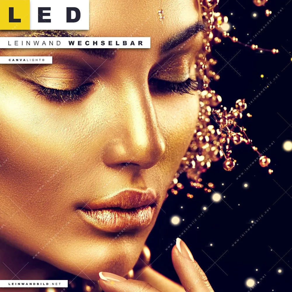 Du bist auf der Suche nach einem Porträts - Menschen LED Leinwandbild im Querformat? Begriffe wie Frau, Farbe, Beauty, Gesicht, Körper, Make-Up, Schminke, Mädchen, Glitzer, Glitter haben Dich auf der Suche nach Deinem neuen XXL LED Wandbild mit wechselbarer Leinwand inspiriert? Farben wie Gold, Schwarz dürfen auf Deinem neuen breiten Leinwand-LED-Bild nicht fehlen und Leuchtbilder im Modern Art, Minimalistisch Stil passen perfekt zu Deinem Einrichtungsstil?