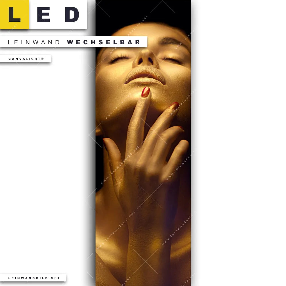 Du bist auf der Suche nach einem Porträts - Menschen LED Leinwandbild im Schmalen Format? Begriffe wie Frau, Farbe, Beauty, Gesicht, Körper haben Dich auf der Suche nach Deinem neuen XXL LED Wandbild mit wechselbarer Leinwand inspiriert? Farben wie Gold, Schwarz dürfen auf Deinem neuen Leinwand-LED-Bild im Panorama-Hochformat nicht fehlen und Leuchtbilder im Modern Art Stil passen perfekt zu Deinem Einrichtungsstil?