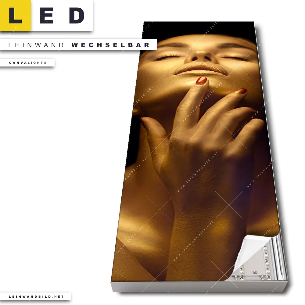 Dann sollte das LED Leinwandbild Canvalight® TEX | Golden Skin | Schmal den Weg zu Dir finden. Das stufenlos dimmbare Leinwandbild sinnliche Frau in Gold im steckerfertigen Leuchtrahmen mit Fernbedienung und optionaler Farbtemperatursteuerung fügt sich als Eye-Catcher harmonisch in jedes Bar - Gastronomie, Friseur - Beauty, Wohnzimmer - Schlafzimmer Raumkonzept ein.