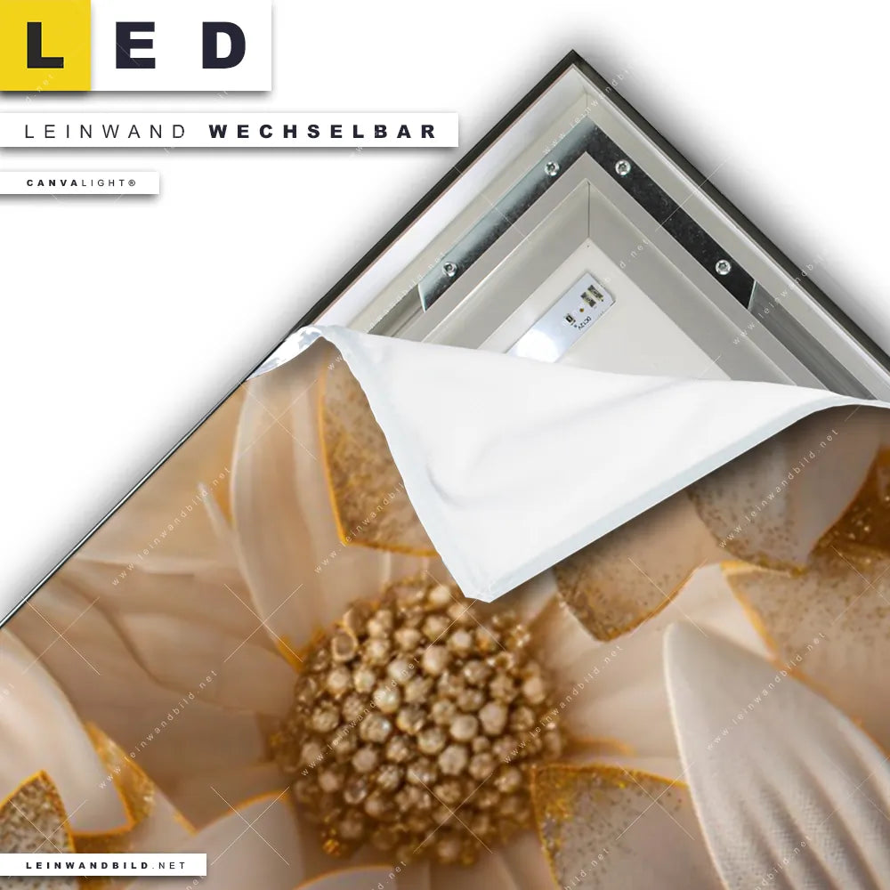 Du bist auf der Suche nach einem Blumen - Botanik LED Leinwandbild im Panorama-Format? Begriffe wie Blüten, Natur, Pflanze, Glitzer, Blütenmeer, Sonnenblumen haben Dich auf der Suche nach Deinem neuen XXL LED Wandbild mit wechselbarer Leinwand inspiriert? Farben wie Weiss, Gold, Braun dürfen auf Deinem neuen extra breiten Leinwand-LED-Bild nicht fehlen und Leuchtbilder im Floral, Modern Art Stil passen perfekt zu Deinem Einrichtungsstil?