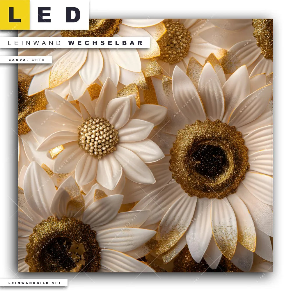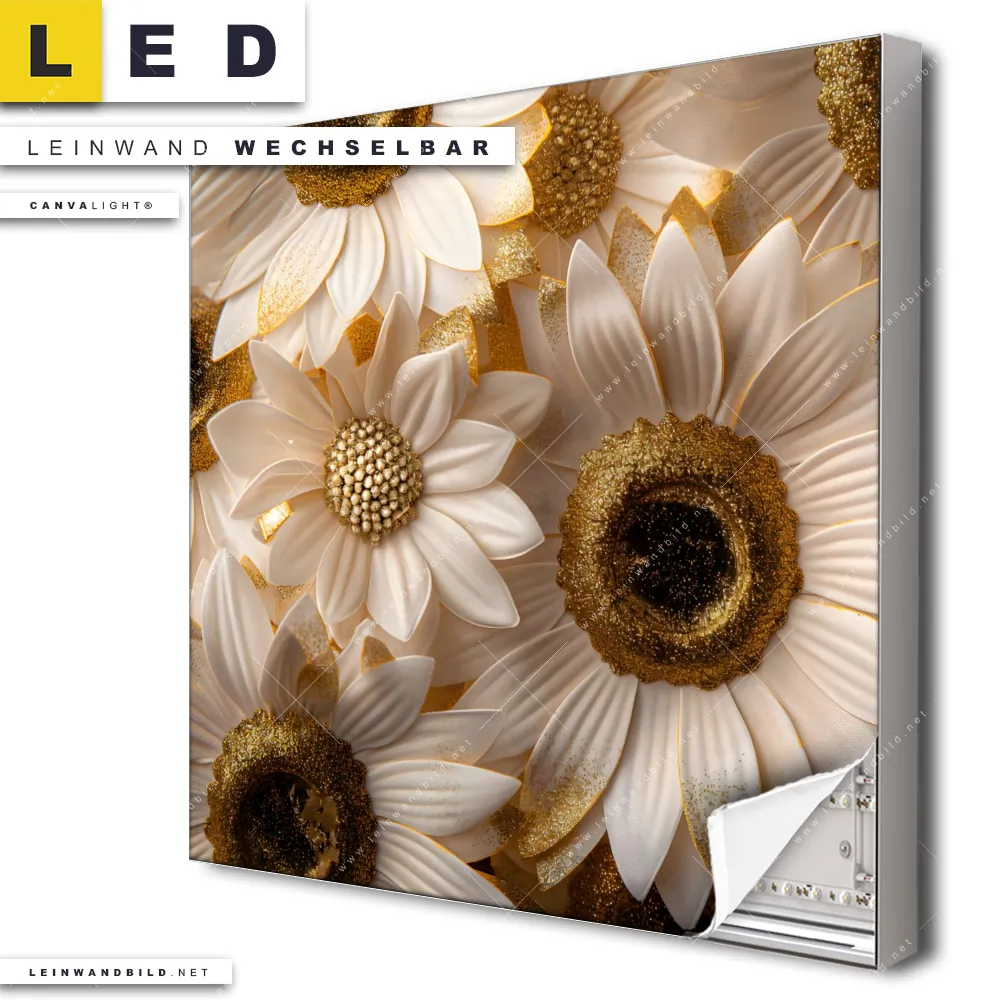 Du bist auf der Suche nach einem Blumen - Botanik LED Leinwandbild im Quadratischen Format? Begriffe wie Blüten, Natur, Pflanze, Glitzer, Blütenmeer, Sonnenblumen haben Dich auf der Suche nach Deinem neuen XXL LED Wandbild mit wechselbarer Leinwand inspiriert? Farben wie Weiss, Gold, Braun dürfen auf Deinem neuen Leinwand-LED-Bild nicht fehlen und Leuchtbilder im Floral, Modern Art Stil passen perfekt zu Deinem Einrichtungsstil?