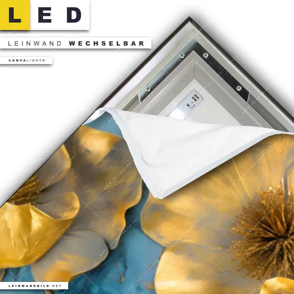 Du konfigurierst Dein individuelles LED Leinwandbild Canvalight® TEX | Goldene Blumen auf Blau | Panorama und wir produzieren es NEU für Dich. Unsere Blumen - Botanik LED Bilder mit wechselbarer Textil-Leinwand sind KEINE Lagerware. Du bist Dir unsicher, welches Motiv oder Format das richtige für dein individuelles Canvalight® Leuchtbild ist, dann helfen wir dir gerne weiter und beraten dich!