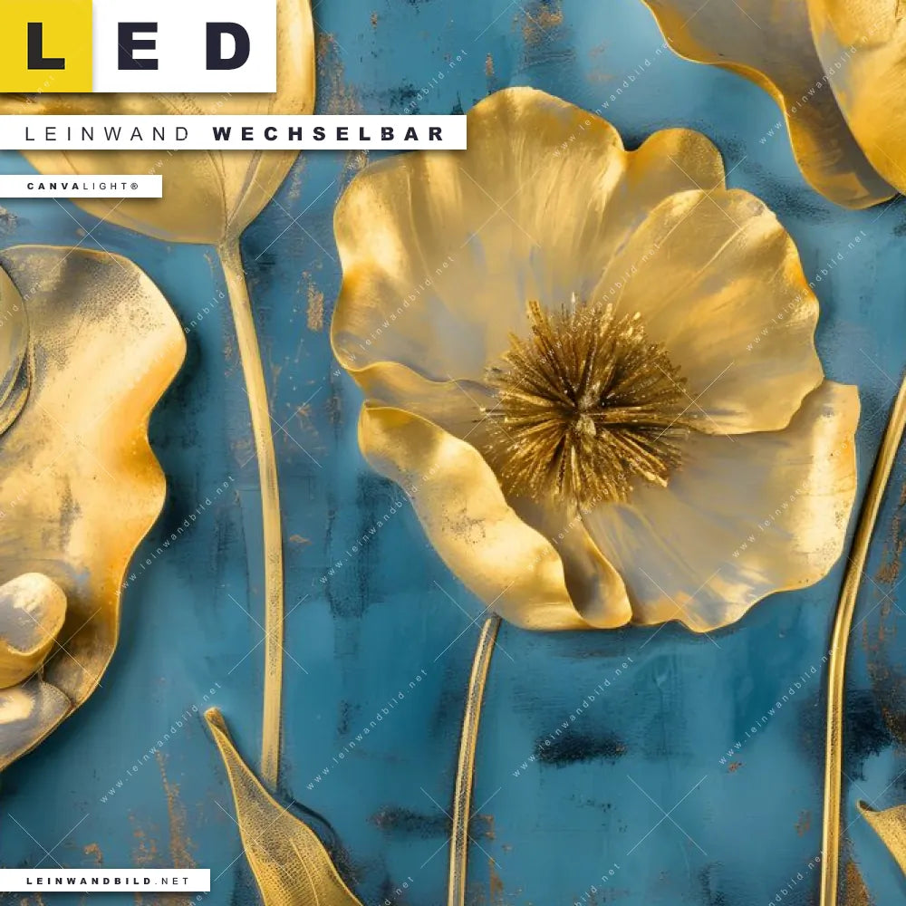 Dann sollte das LED Leinwandbild Canvalight® TEX | Goldene Blumen auf Blau | Panorama den Weg zu Dir finden. Das stufenlos dimmbare Leinwandbild Klatschmohn in Gold im steckerfertigen Leuchtrahmen mit Fernbedienung und optionaler Farbtemperatursteuerung fügt sich als Eye-Catcher harmonisch in jedes Flur - Eingangsbereich, Wohnzimmer - Schlafzimmer, Arzt - Praxis Raumkonzept ein.