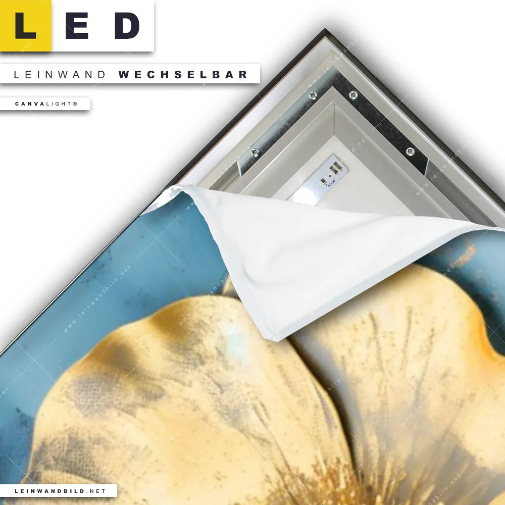 Du konfigurierst Dein individuelles LED Leinwandbild Canvalight® TEX | Goldene Blumen auf Blau | Schmal und wir produzieren es NEU für Dich. Unsere Blumen - Botanik LED Bilder mit wechselbarer Textil-Leinwand sind KEINE Lagerware. Du bist Dir unsicher, welches Motiv oder Format das richtige für dein individuelles Canvalight® Leuchtbild ist, dann helfen wir dir gerne weiter und beraten dich!