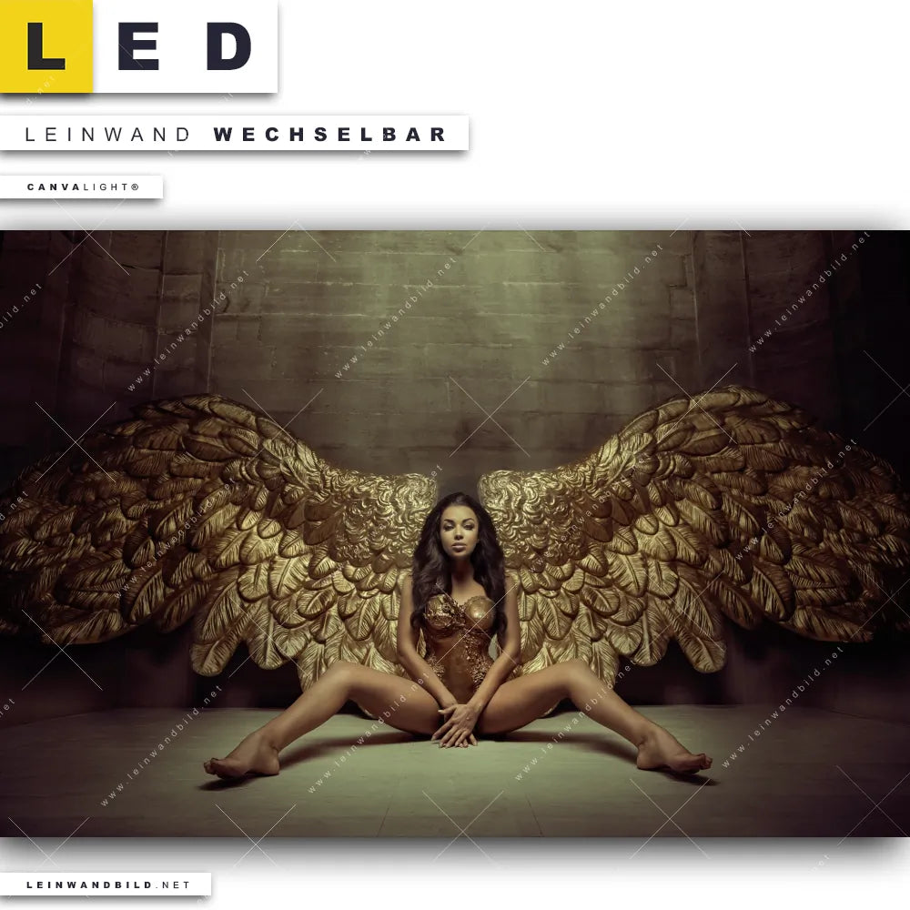 Du bist auf der Suche nach einem Porträts - Menschen LED Leinwandbild im Querformat? Begriffe wie Frau, Erotik, modern, Gold, sexy, Körper, Beauty, Flügel, Engel haben Dich auf der Suche nach Deinem neuen XXL LED Wandbild mit wechselbarer Leinwand inspiriert? Farben wie Gold, Schwarz dürfen auf Deinem neuen breiten Leinwand-LED-Bild nicht fehlen und Leuchtbilder im Modern Art, Natürlich - Realistisch Stil passen perfekt zu Deinem Einrichtungsstil?