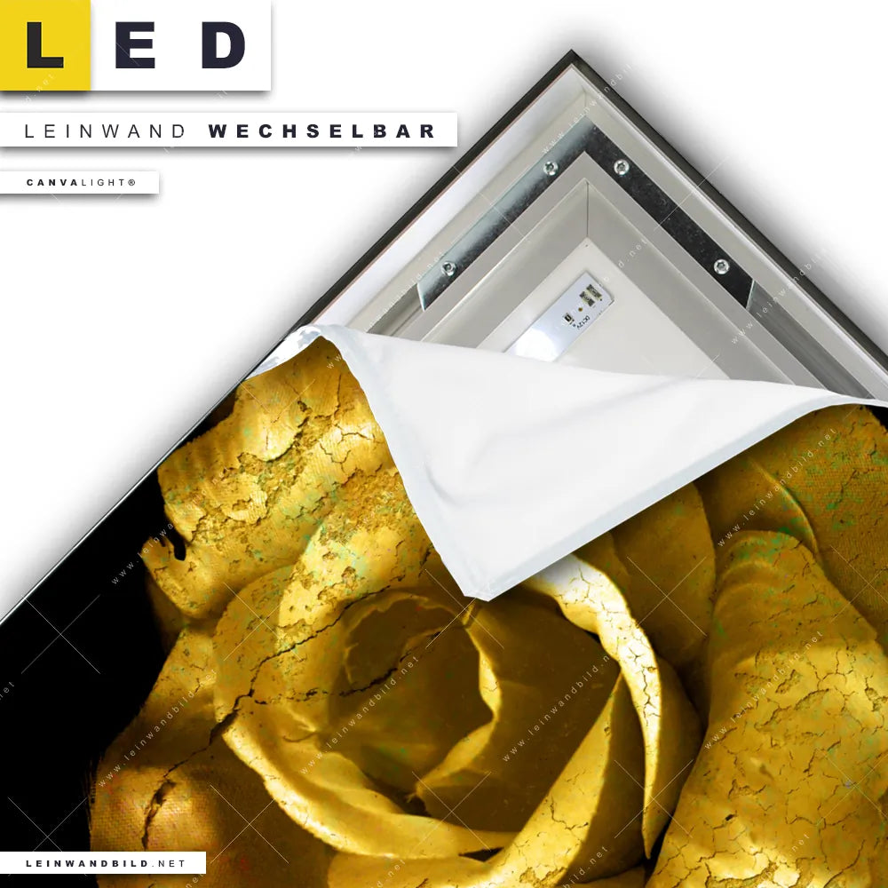 Du konfigurierst Dein individuelles LED Leinwandbild Canvalight® TEX | Goldene Rose | Quadrat und wir produzieren es NEU für Dich. Unsere Blumen - Botanik LED Bilder mit wechselbarer Textil-Leinwand sind KEINE Lagerware. Du bist Dir unsicher, welches Motiv oder Format das richtige für dein individuelles Canvalight® Leuchtbild ist, dann helfen wir dir gerne weiter und beraten dich!