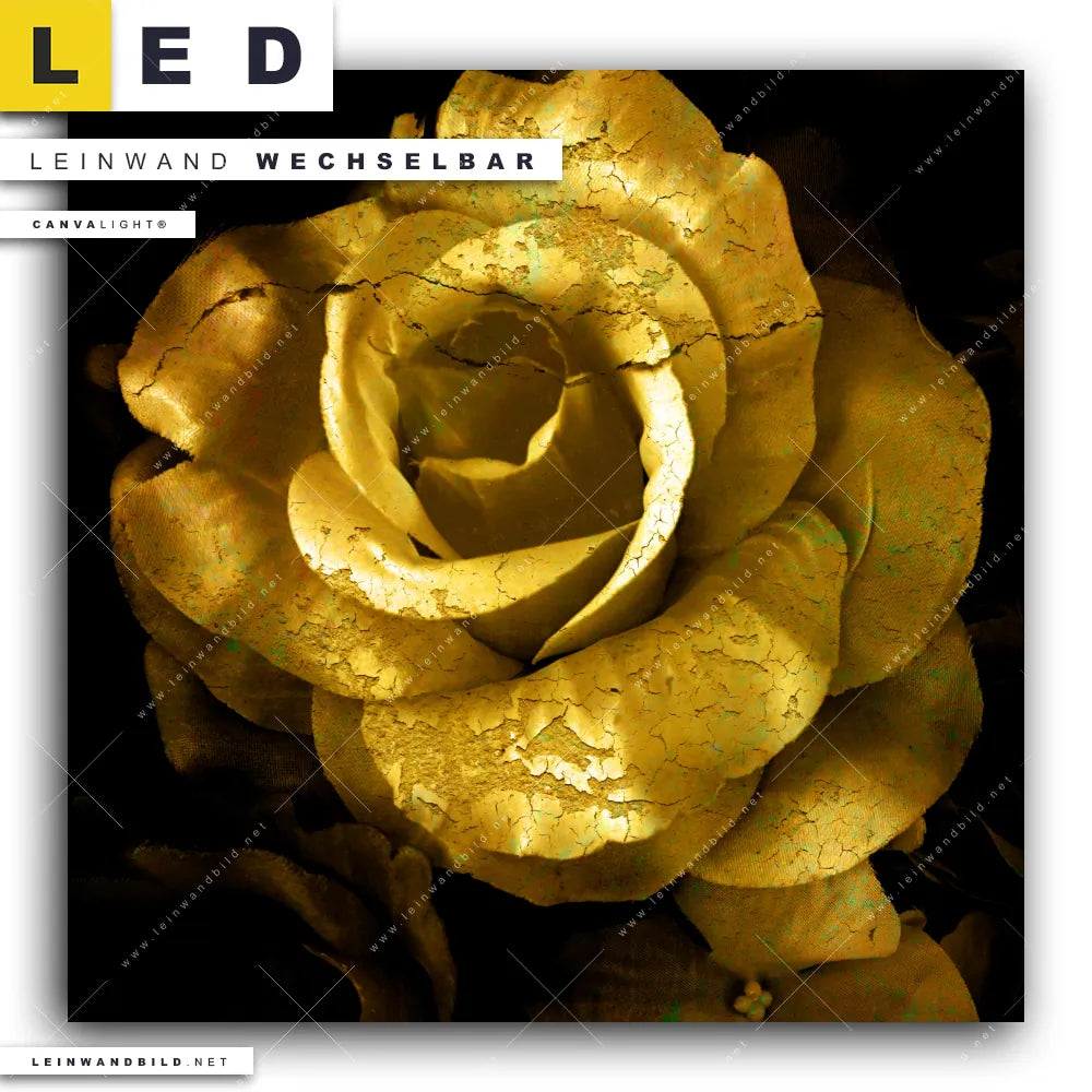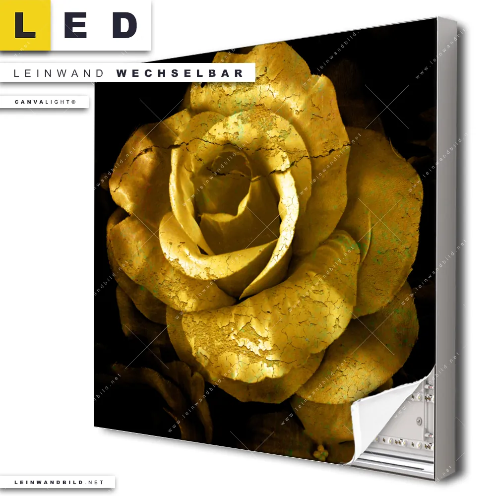 Dann sollte das LED Leinwandbild Canvalight® TEX | Goldene Rose | Quadrat den Weg zu Dir finden. Das stufenlos dimmbare Leinwandbild goldene Blüte im steckerfertigen Leuchtrahmen mit Fernbedienung und optionaler Farbtemperatursteuerung fügt sich als Eye-Catcher harmonisch in jedes Wohnzimmer - Schlafzimmer, Friseur - Beauty, Flur - Eingangsbereich, Büro - Kanzlei, Arzt - Praxis Raumkonzept ein.