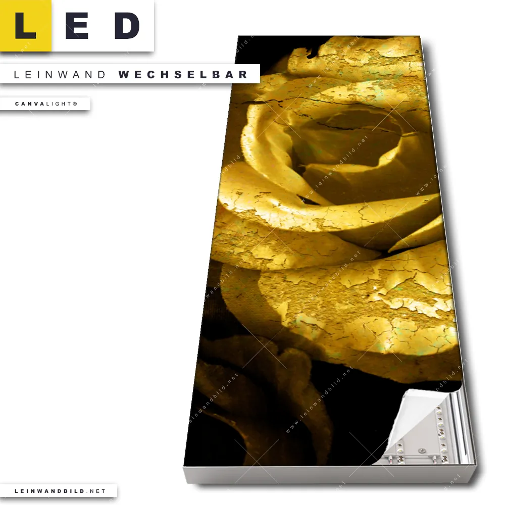 Dann sollte das LED Leinwandbild Canvalight® TEX | Goldene Rose | Schmal den Weg zu Dir finden. Das stufenlos dimmbare Leinwandbild Goldrose im steckerfertigen Leuchtrahmen mit Fernbedienung und optionaler Farbtemperatursteuerung fügt sich als Eye-Catcher harmonisch in jedes Wohnzimmer - Schlafzimmer, Friseur - Beauty, Flur - Eingangsbereich, Büro - Kanzlei, Arzt - Praxis Raumkonzept ein.