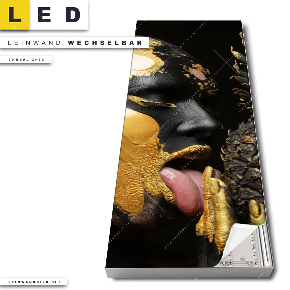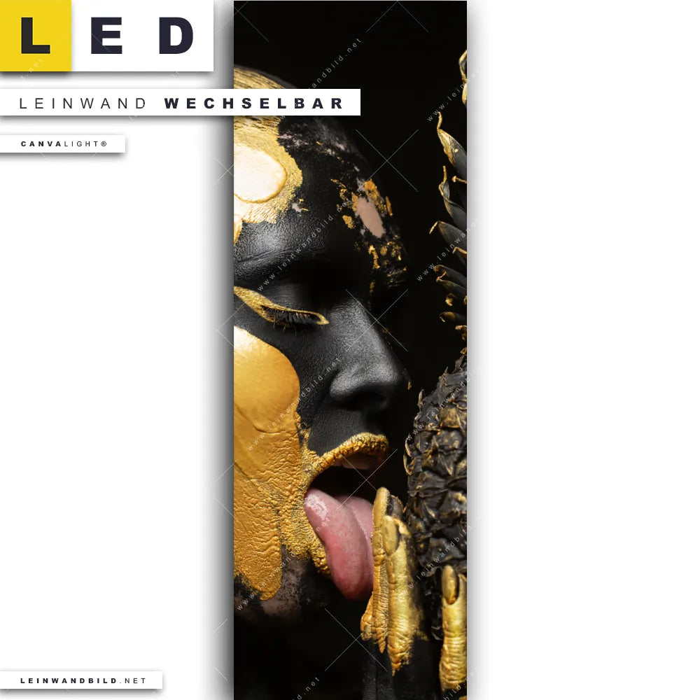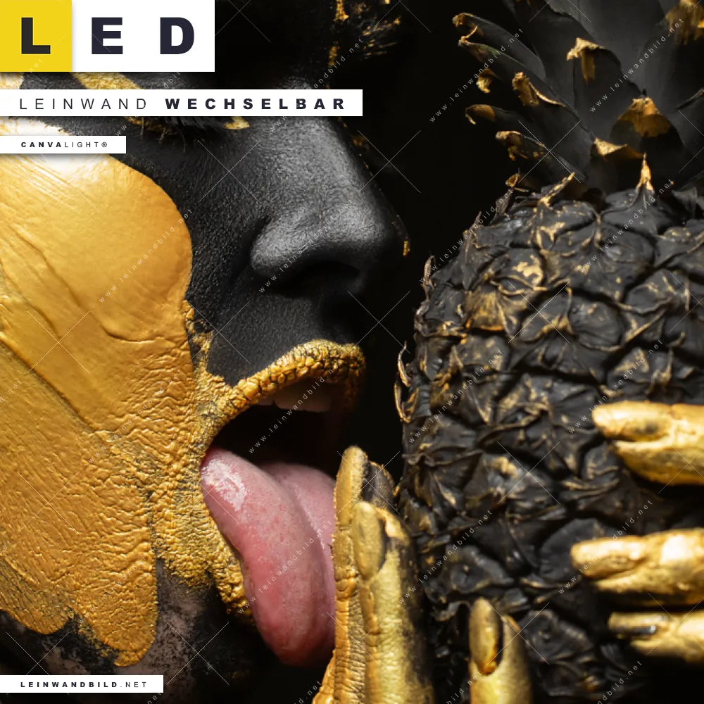 Du bist auf der Suche nach einem Porträts - Menschen LED Leinwandbild im Schmalen Format? Begriffe wie Frau, Lippen, Mund, Ananas, Früchte, Gesicht, Körper, Beauty, Make-up, Gold haben Dich auf der Suche nach Deinem neuen XXL LED Wandbild mit wechselbarer Leinwand inspiriert? Farben wie Gold, Schwarz dürfen auf Deinem neuen Leinwand-LED-Bild im Panorama-Hochformat nicht fehlen und Leuchtbilder im Modern Art, Grunge, Mixed Media Stil passen perfekt zu Deinem Einrichtungsstil?