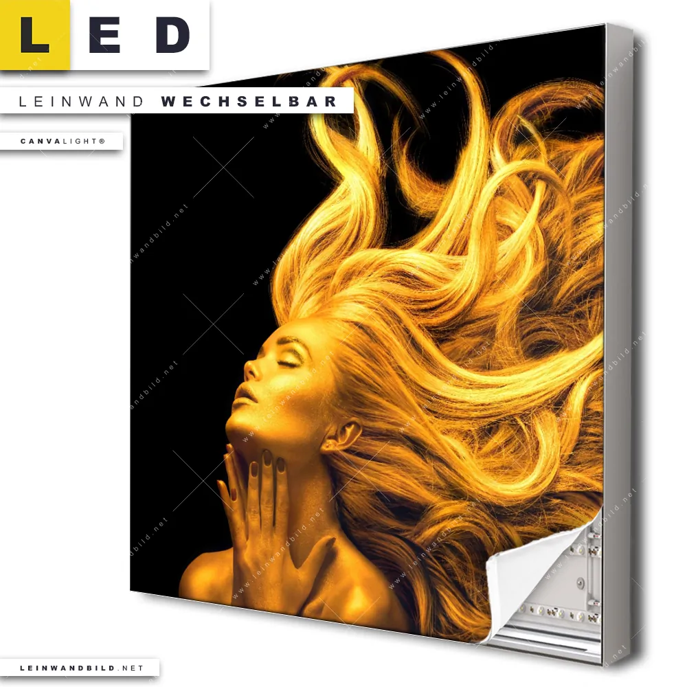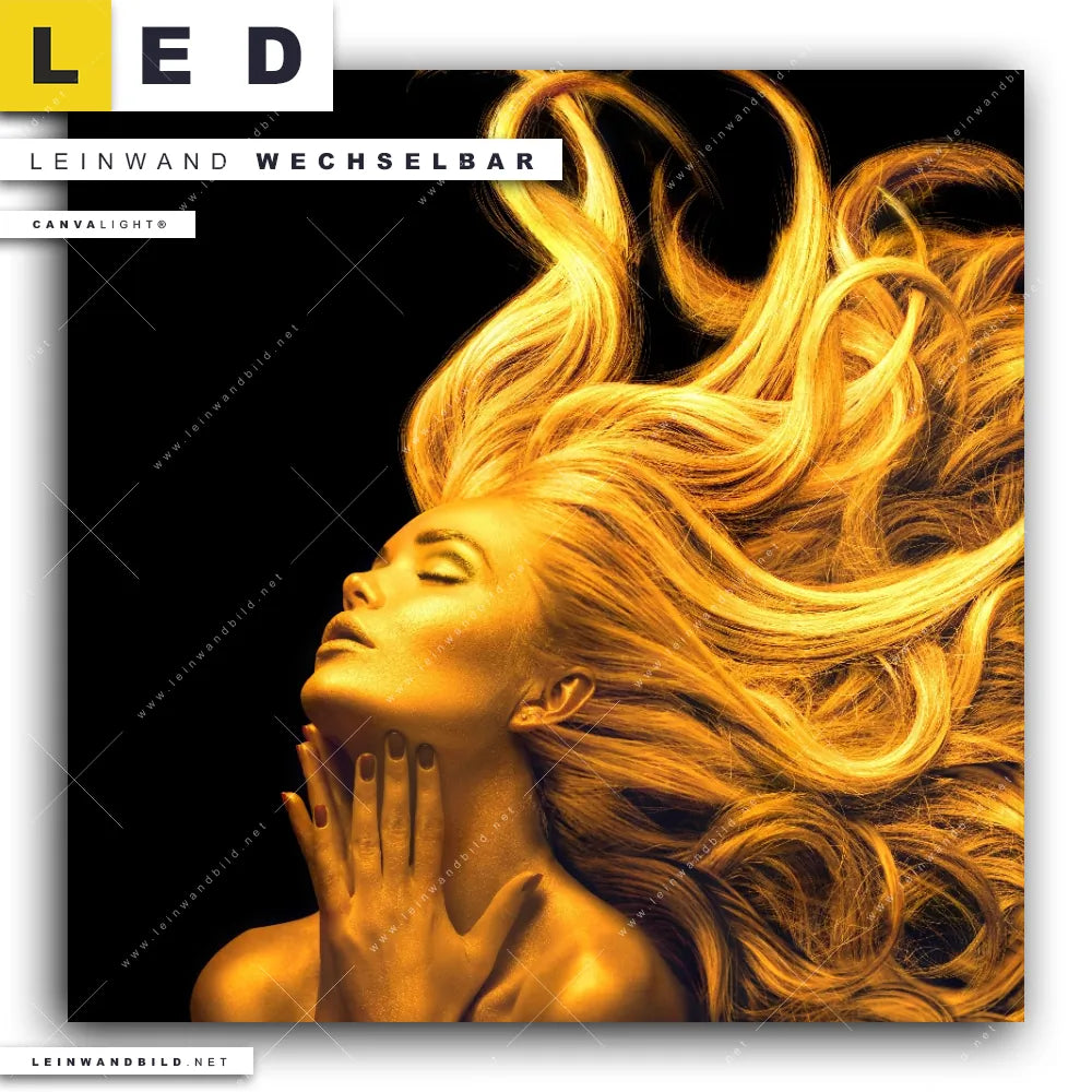 Dann sollte das LED Leinwandbild Canvalight® TEX | Goldenes Haar No.3 | Quadrat den Weg zu Dir finden. Das stufenlos dimmbare Leinwandbild Frauenporträt in Gold im steckerfertigen Leuchtrahmen mit Fernbedienung und optionaler Farbtemperatursteuerung fügt sich als Eye-Catcher harmonisch in jedes Friseur - Beauty, Wohnzimmer - Schlafzimmer Raumkonzept ein.