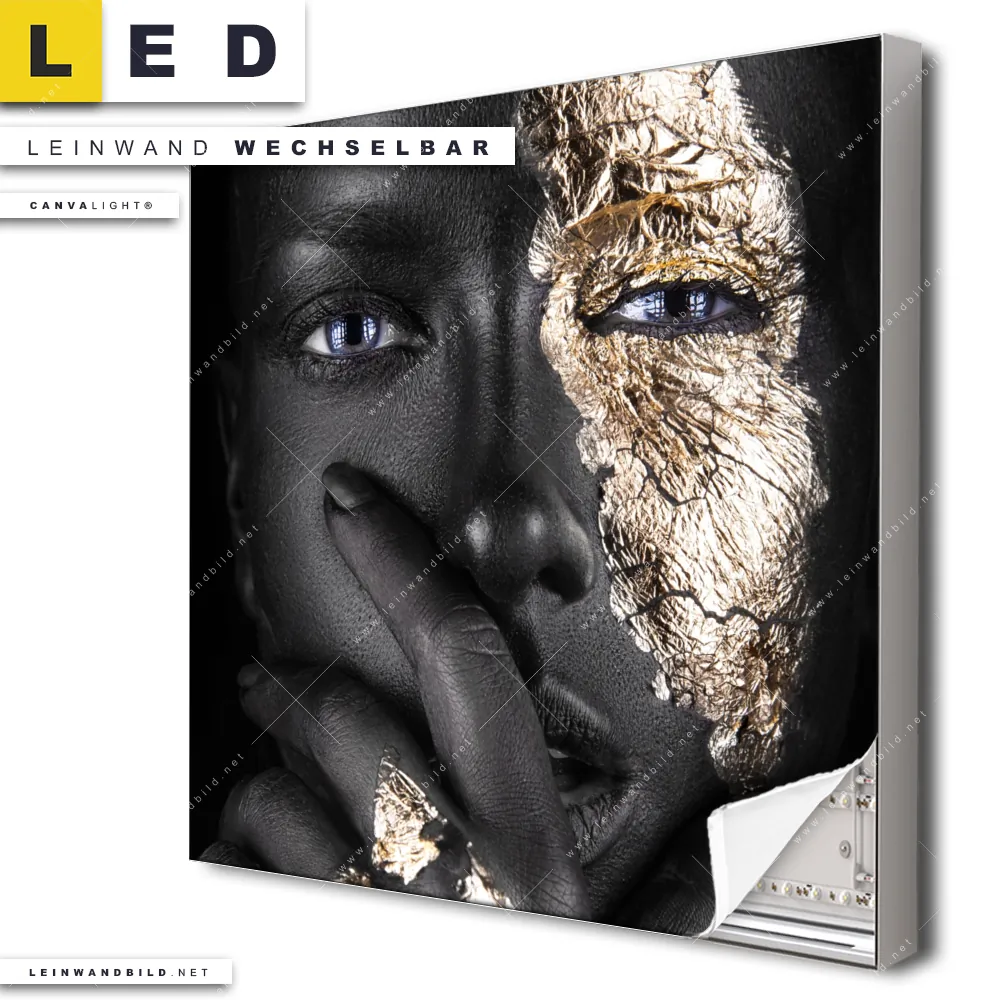 Du bist auf der Suche nach einem Porträts - Menschen LED Leinwandbild im Quadratischen Format? Begriffe wie Frau, Porträt, Erotik, modern, Gold, Farbe, Beauty, Gesicht, Körper, Make-up haben Dich auf der Suche nach Deinem neuen XXL LED Wandbild mit wechselbarer Leinwand inspiriert? Farben wie Gold, Schwarz dürfen auf Deinem neuen Leinwand-LED-Bild nicht fehlen und Leuchtbilder im Modern Art Stil passen perfekt zu Deinem Einrichtungsstil?
