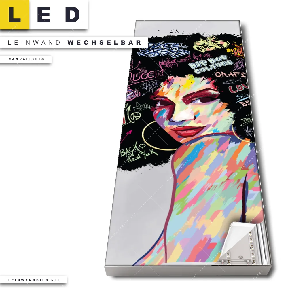 Du konfigurierst Dein individuelles LED Leinwandbild Canvalight® TEX | Graffiti Afro No.1 | Schmal und wir produzieren es NEU für Dich. Unsere Porträts - Menschen LED Bilder mit wechselbarer Textil-Leinwand sind KEINE Lagerware. Du bist Dir unsicher, welches Motiv oder Format das richtige für dein individuelles Canvalight® Leuchtbild ist, dann helfen wir dir gerne weiter und beraten dich!