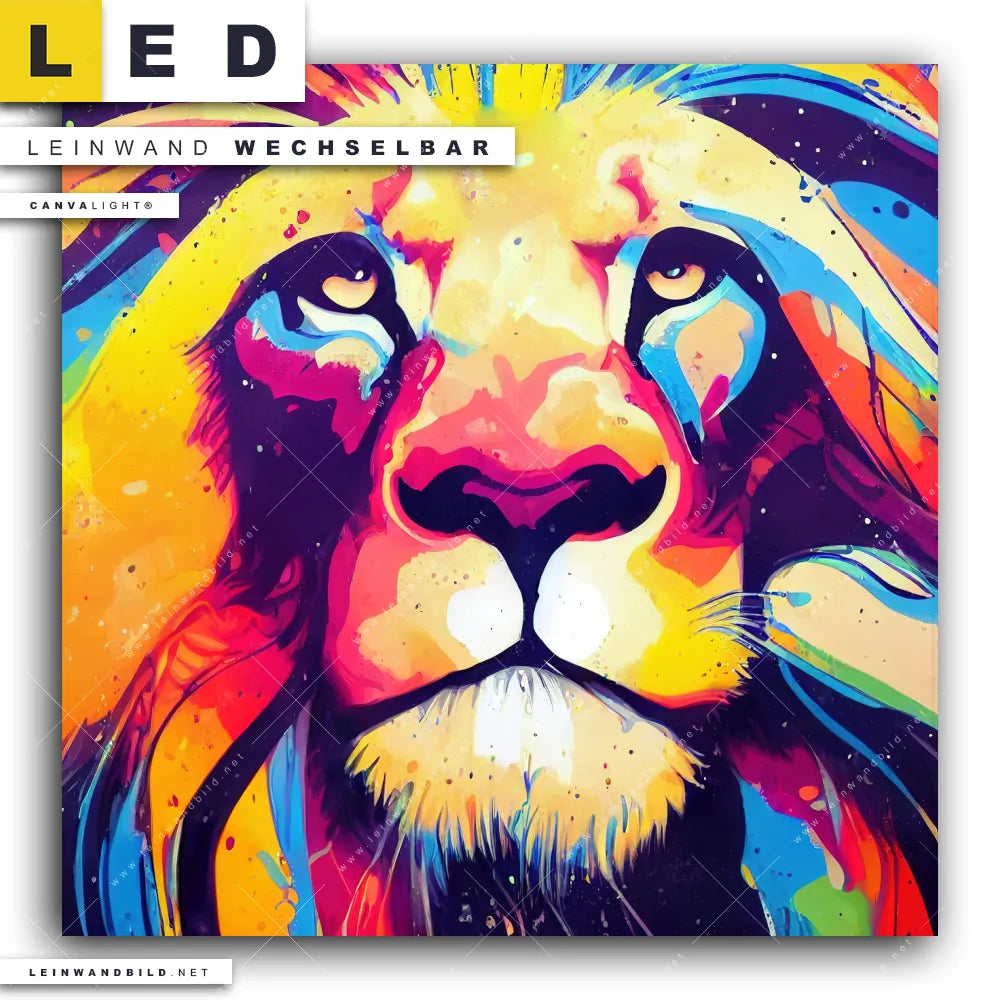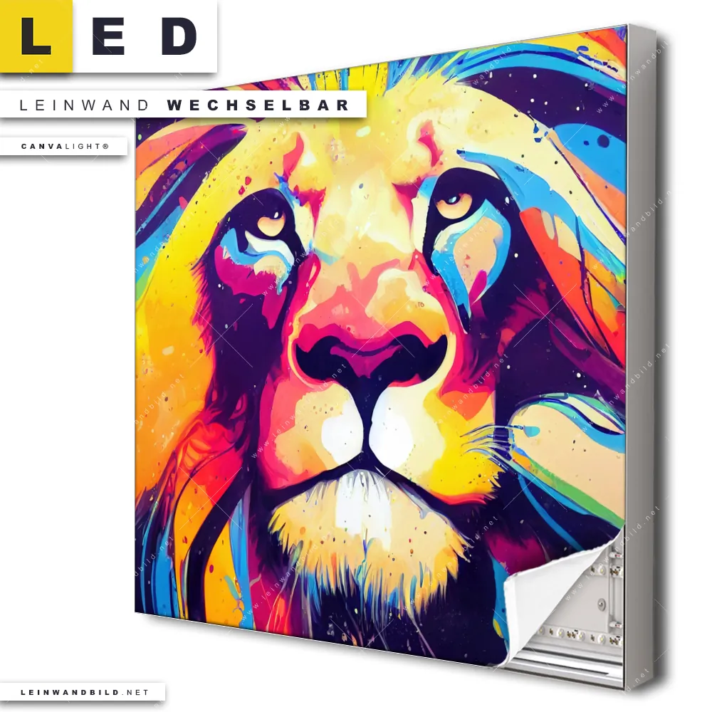 Du bist auf der Suche nach einem Tierwelt LED Leinwandbild im Quadratischen Format? Begriffe wie Raubkatze, Löwe, Afrika, Dschungel, Lion, Graffiti, Raubtier, Löwenkopf, Wildtier, Farbexplosion, Farbspritzer, Farbe, Portät haben Dich auf der Suche nach Deinem neuen XXL LED Wandbild mit wechselbarer Leinwand inspiriert? Farben wie Blau, Pink, Orange dürfen auf Deinem neuen Leinwand-LED-Bild nicht fehlen und Leuchtbilder im Abstrakt, Modern Art, Pop Art, Street Art Stil passen perfekt zu Deinem Einrichtungsstil?