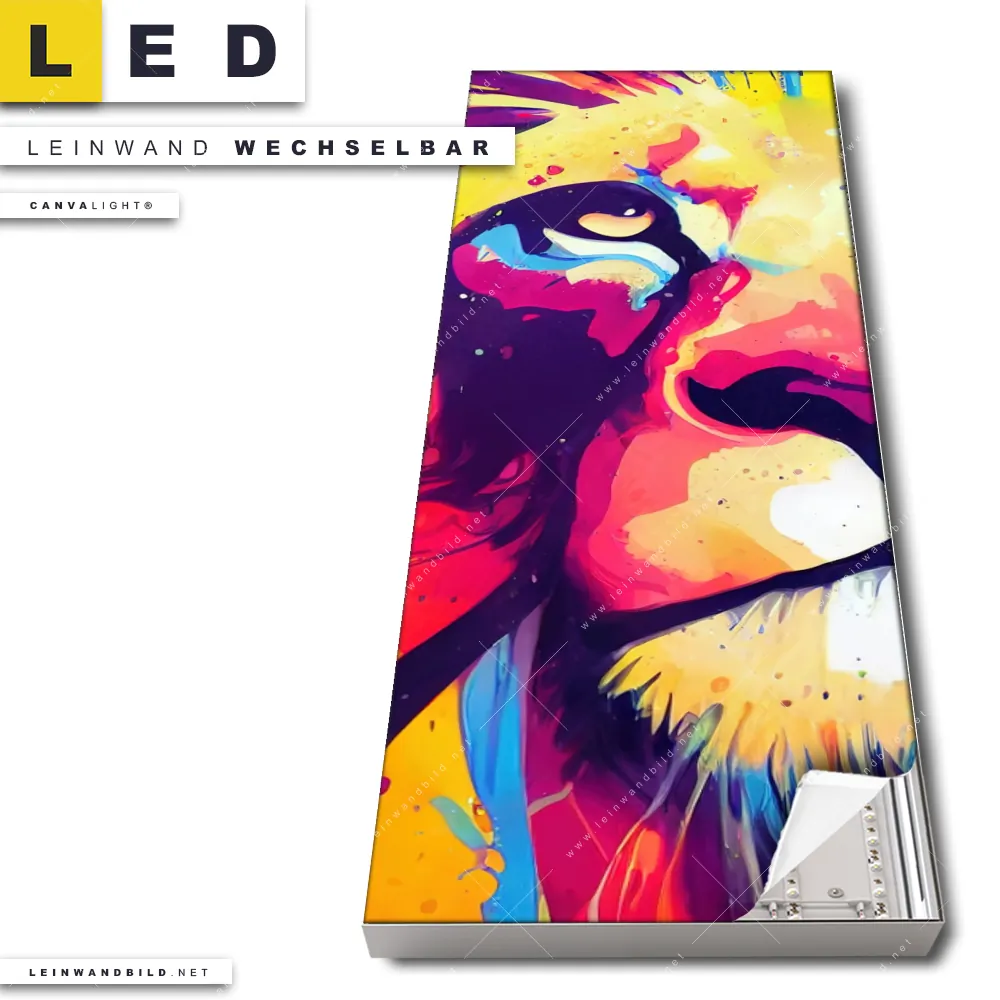 Du konfigurierst Dein individuelles LED Leinwandbild Canvalight® TEX | Graffiti Löwe | Schmal und wir produzieren es NEU für Dich. Unsere Tierwelt LED Bilder mit wechselbarer Textil-Leinwand sind KEINE Lagerware. Du bist Dir unsicher, welches Motiv oder Format das richtige für dein individuelles Canvalight® Leuchtbild ist, dann helfen wir dir gerne weiter und beraten dich!