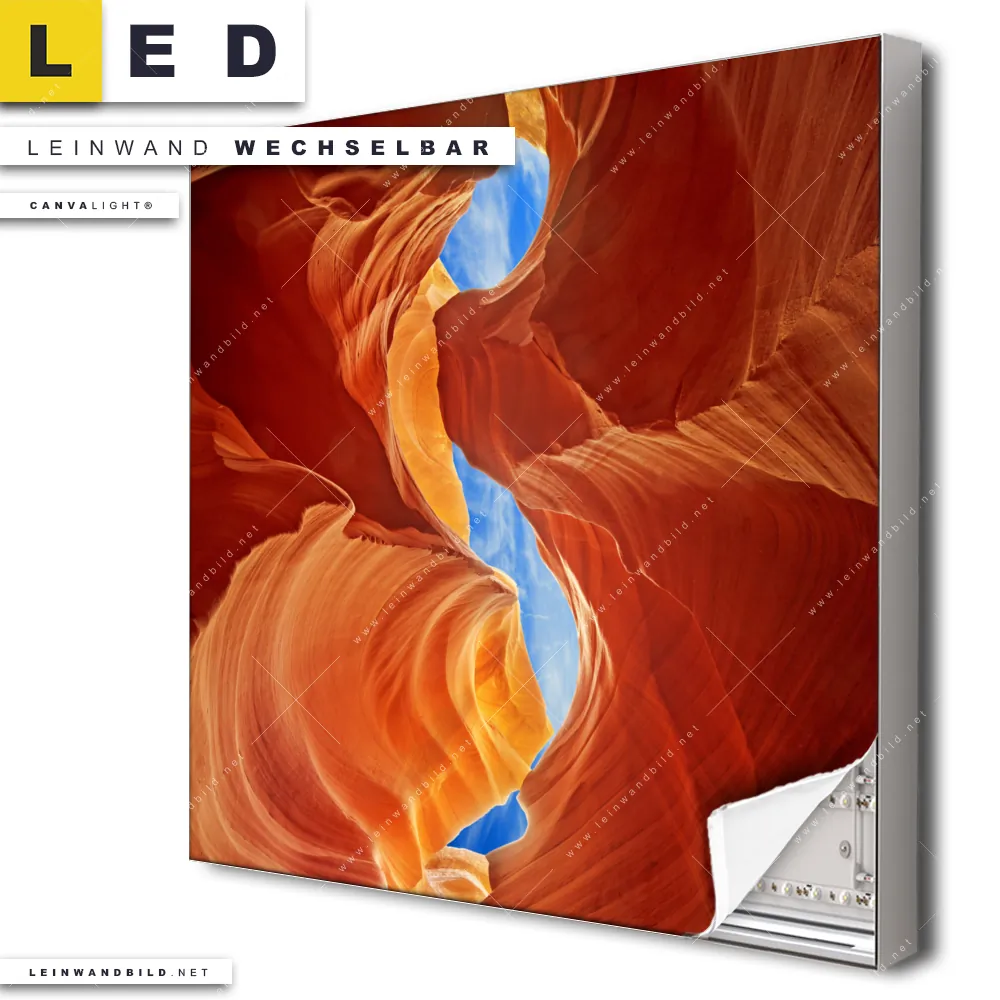 Du bist auf der Suche nach einem Landschaften, Muster - Texturen LED Leinwandbild im Quadratischen Format? Begriffe wie Natur, Ruhe, Stille, Froschperspektive, Schlucht haben Dich auf der Suche nach Deinem neuen XXL LED Wandbild mit wechselbarer Leinwand inspiriert? Farben wie Blau, Orange, Ocker, Rot dürfen auf Deinem neuen Leinwand-LED-Bild nicht fehlen und Leuchtbilder im Abstrakt, Minimalistisch, Modern Art, Natürlich - Realistisch Stil passen perfekt zu Deinem Einrichtungsstil?