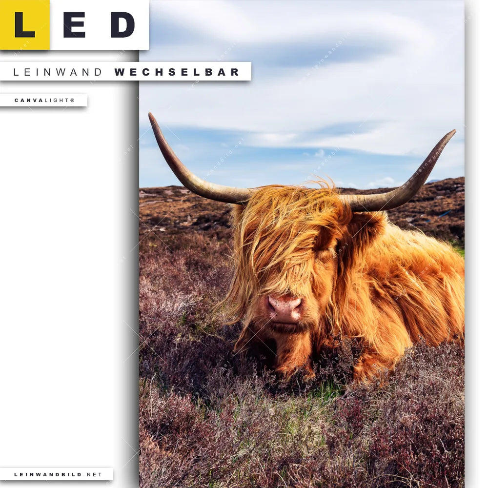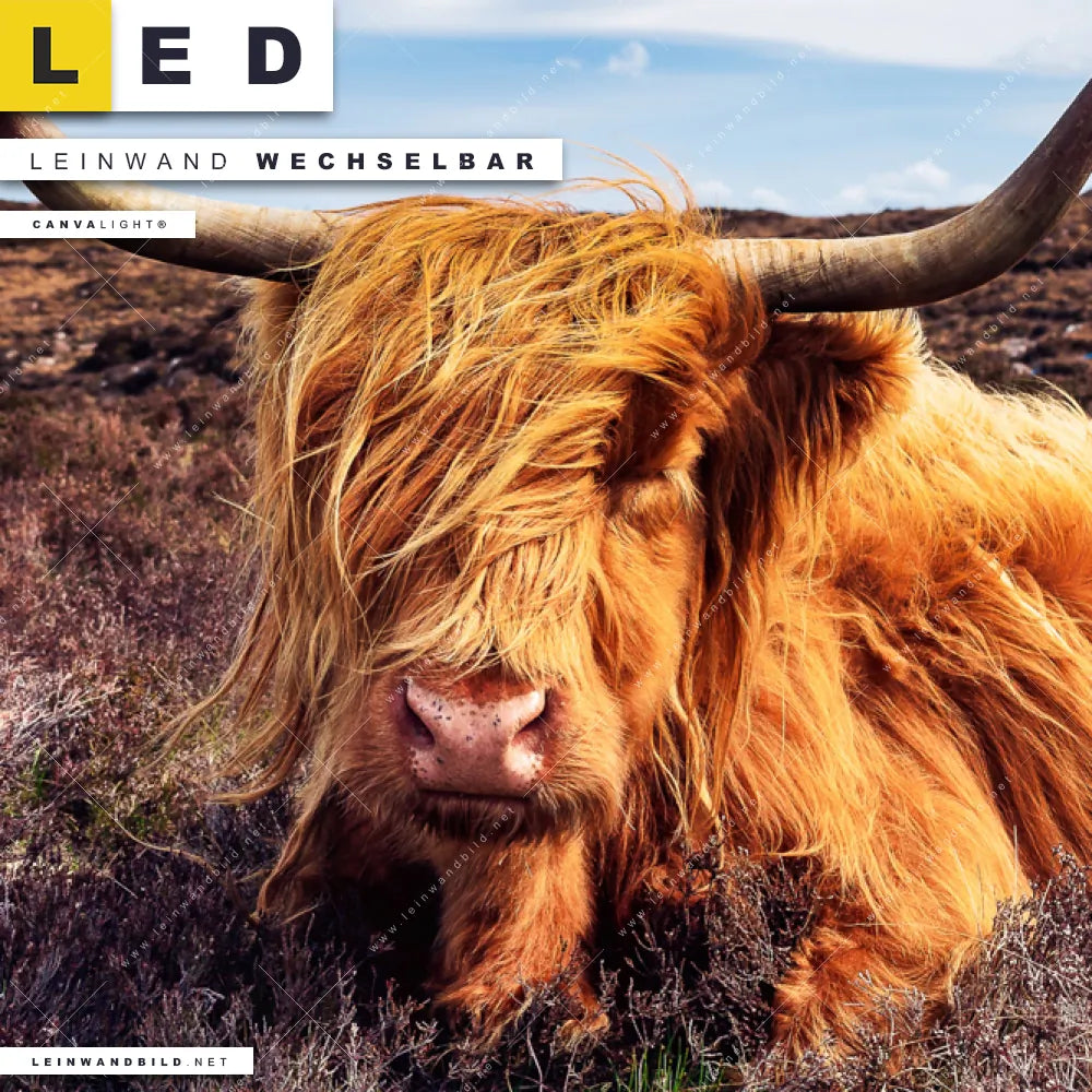 Du bist auf der Suche nach einem Tierwelt LED Leinwandbild im Hochformat? Begriffe wie Tier, Stier, Hochlandkuh, Highlander, Büffel, Rind, Bulle, Hochlandrind, Wiese, Weide, Hörner, Gras haben Dich auf der Suche nach Deinem neuen XXL LED Wandbild mit wechselbarer Leinwand inspiriert? Farben wie Braun, Beige, Hellblau dürfen auf Deinem neuen Leinwand-LED-Bild nicht fehlen und Leuchtbilder im Modern Art, Natürlich - Realistisch Stil passen perfekt zu Deinem Einrichtungsstil?