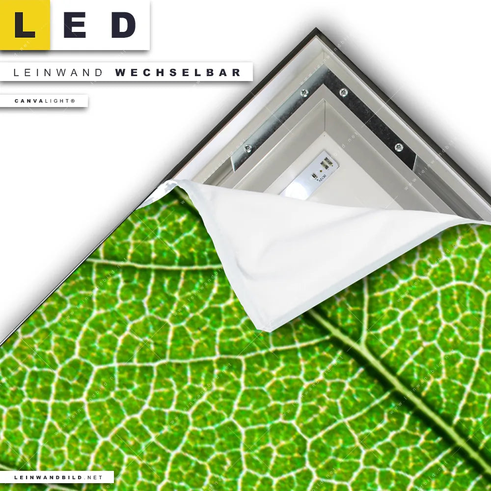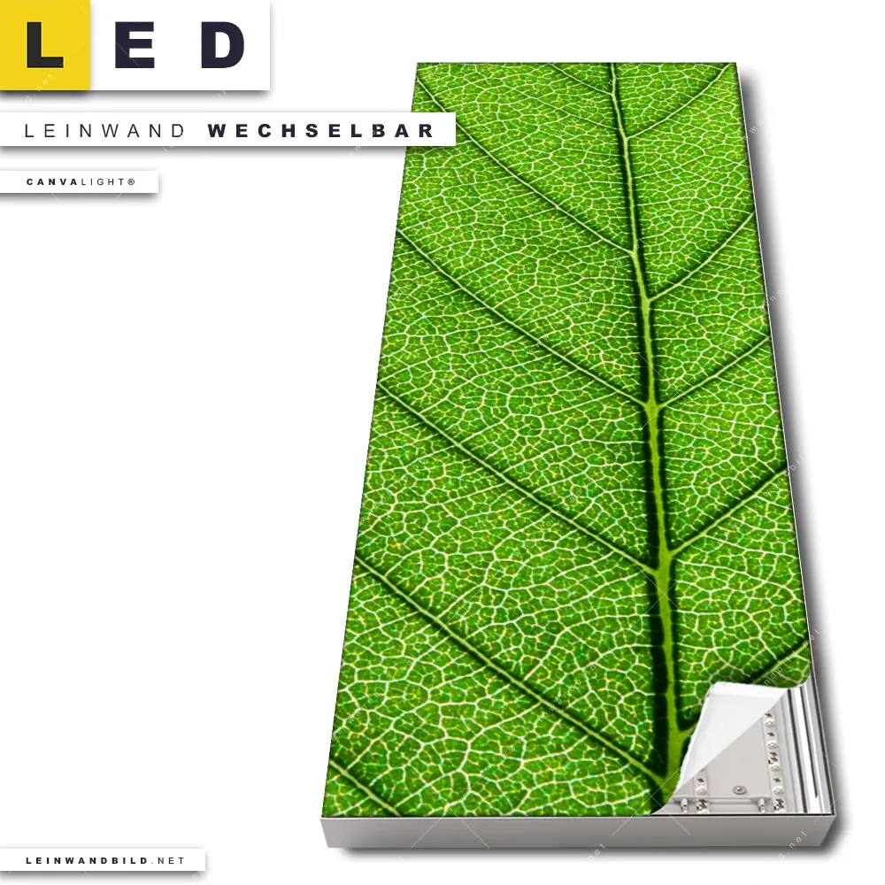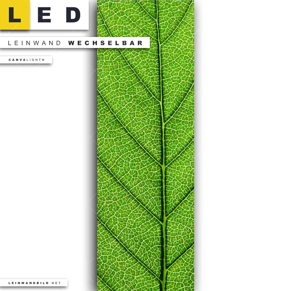 Du konfigurierst Dein individuelles LED Leinwandbild Canvalight® TEX | Grüne Blattadern | Schmal und wir produzieren es NEU für Dich. Unsere Blumen - Botanik, Wald - Bäume LED Bilder mit wechselbarer Textil-Leinwand sind KEINE Lagerware. Du bist Dir unsicher, welches Motiv oder Format das richtige für dein individuelles Canvalight® Leuchtbild ist, dann helfen wir dir gerne weiter und beraten dich!