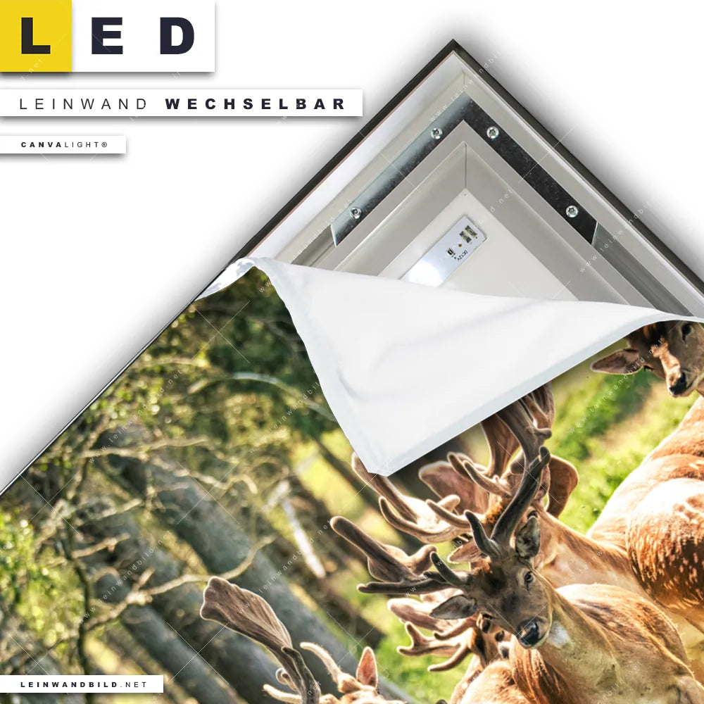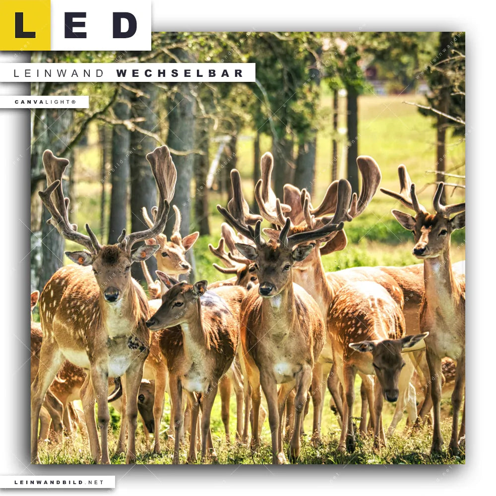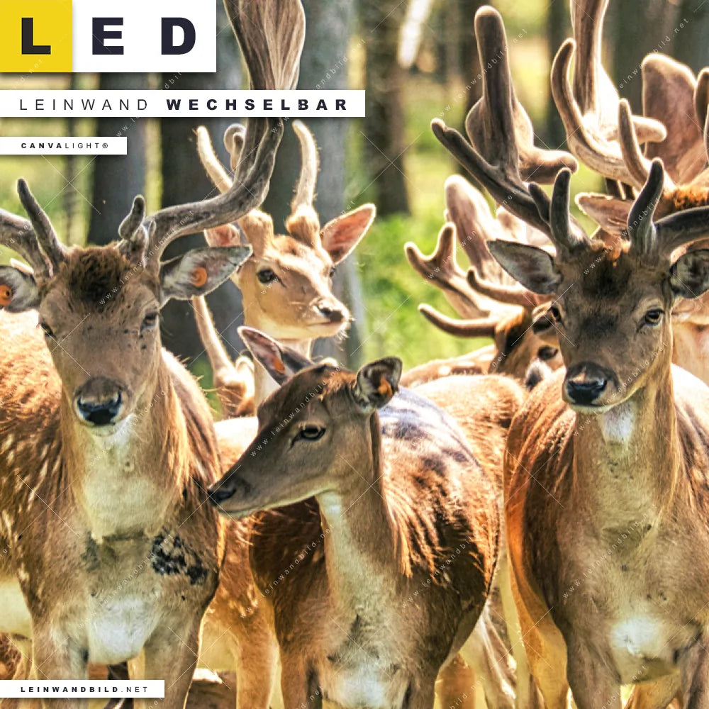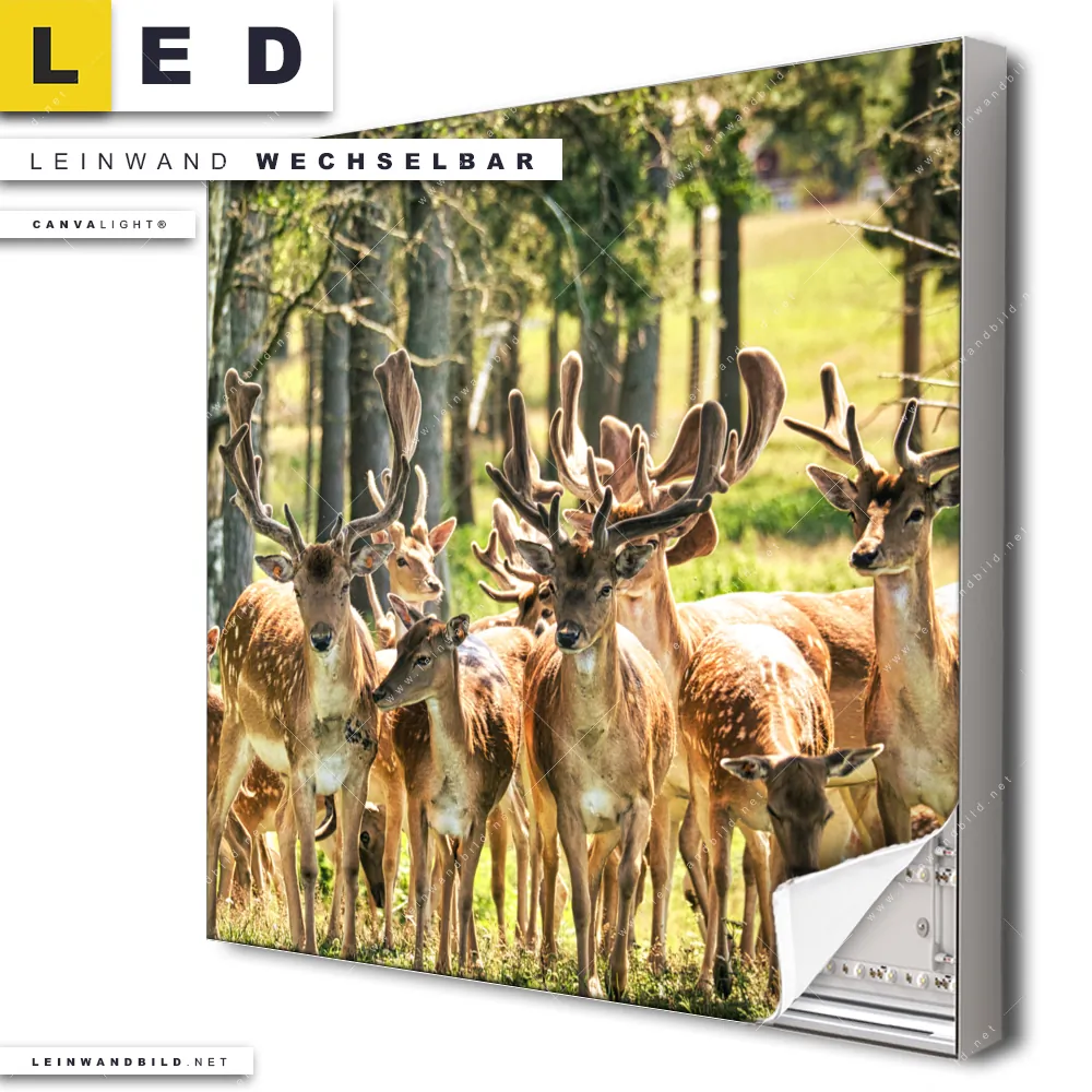 Du konfigurierst Dein individuelles LED Leinwandbild Canvalight® TEX | Gruppe Rotwild | Quadrat und wir produzieren es NEU für Dich. Unsere Landschaften, Tierwelt LED Bilder mit wechselbarer Textil-Leinwand sind KEINE Lagerware. Du bist Dir unsicher, welches Motiv oder Format das richtige für dein individuelles Canvalight® Leuchtbild ist, dann helfen wir dir gerne weiter und beraten dich!