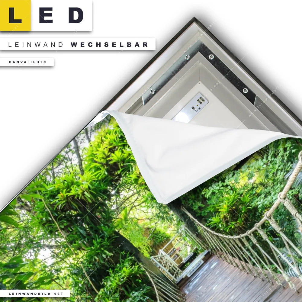 Du konfigurierst Dein individuelles LED Leinwandbild Canvalight® TEX | Hängebrücke im Dschungel | Hochformat und wir produzieren es NEU für Dich. Unsere Landschaften, Wald - Bäume LED Bilder mit wechselbarer Textil-Leinwand sind KEINE Lagerware. Du bist Dir unsicher, welches Motiv oder Format das richtige für dein individuelles Canvalight® Leuchtbild ist, dann helfen wir dir gerne weiter und beraten dich!