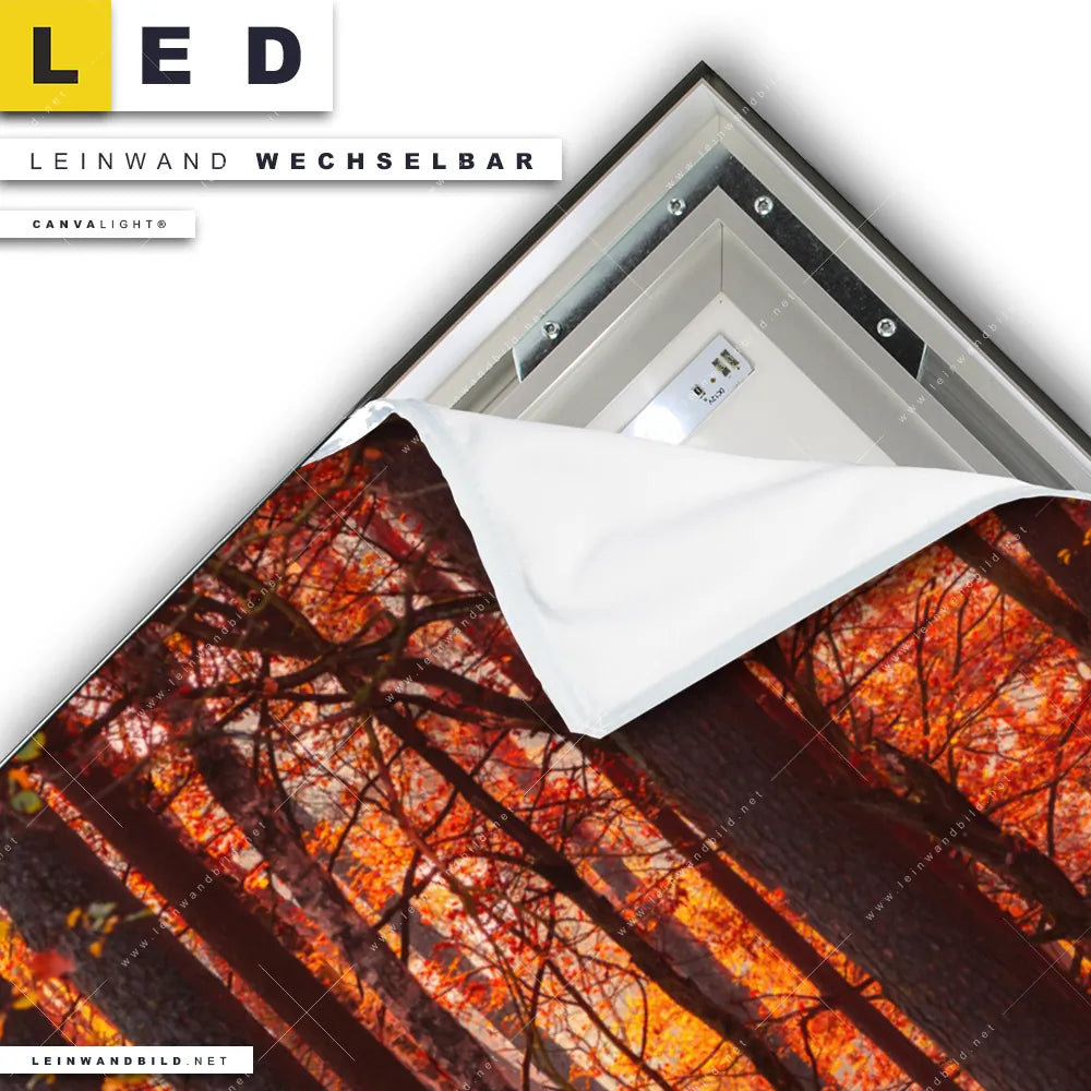 Du konfigurierst Dein individuelles LED Leinwandbild Canvalight® TEX | Herbstwald | Hochformat und wir produzieren es NEU für Dich. Unsere Landschaften, Wald - Bäume LED Bilder mit wechselbarer Textil-Leinwand sind KEINE Lagerware. Du bist Dir unsicher, welches Motiv oder Format das richtige für dein individuelles Canvalight® Leuchtbild ist, dann helfen wir dir gerne weiter und beraten dich!