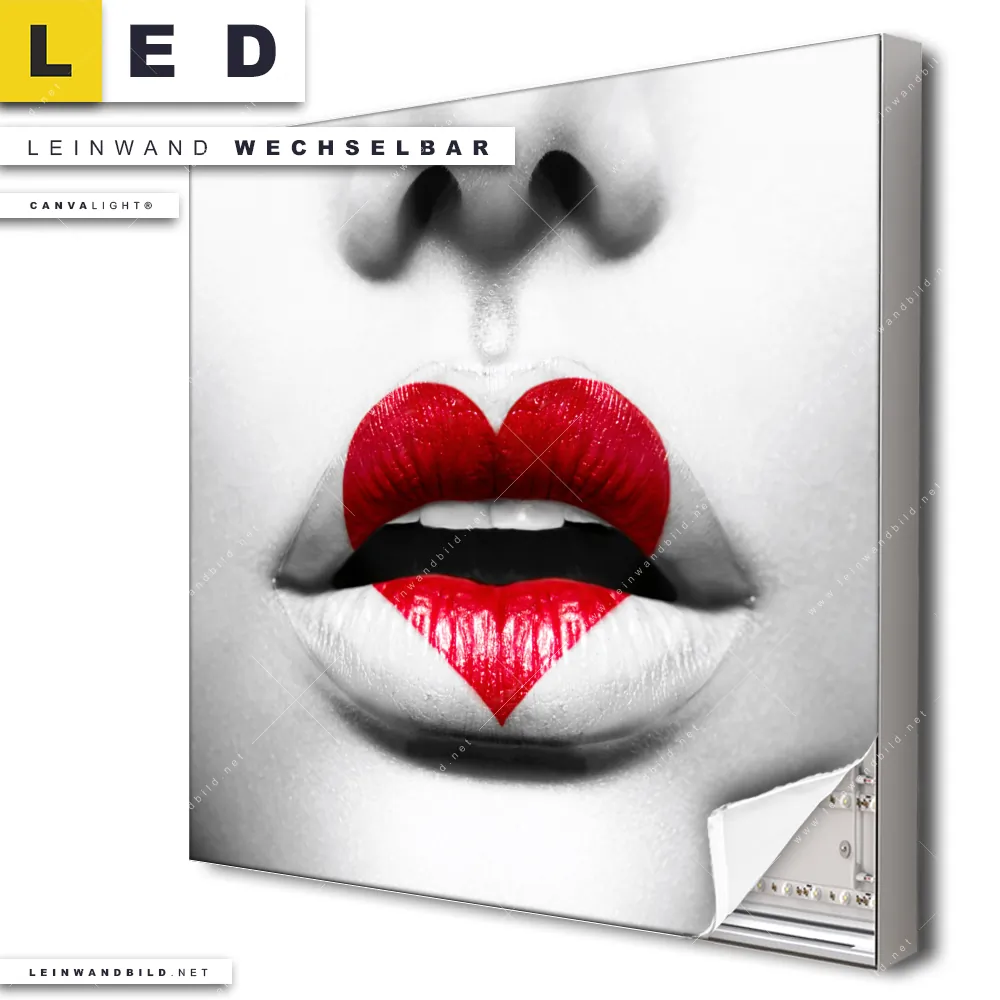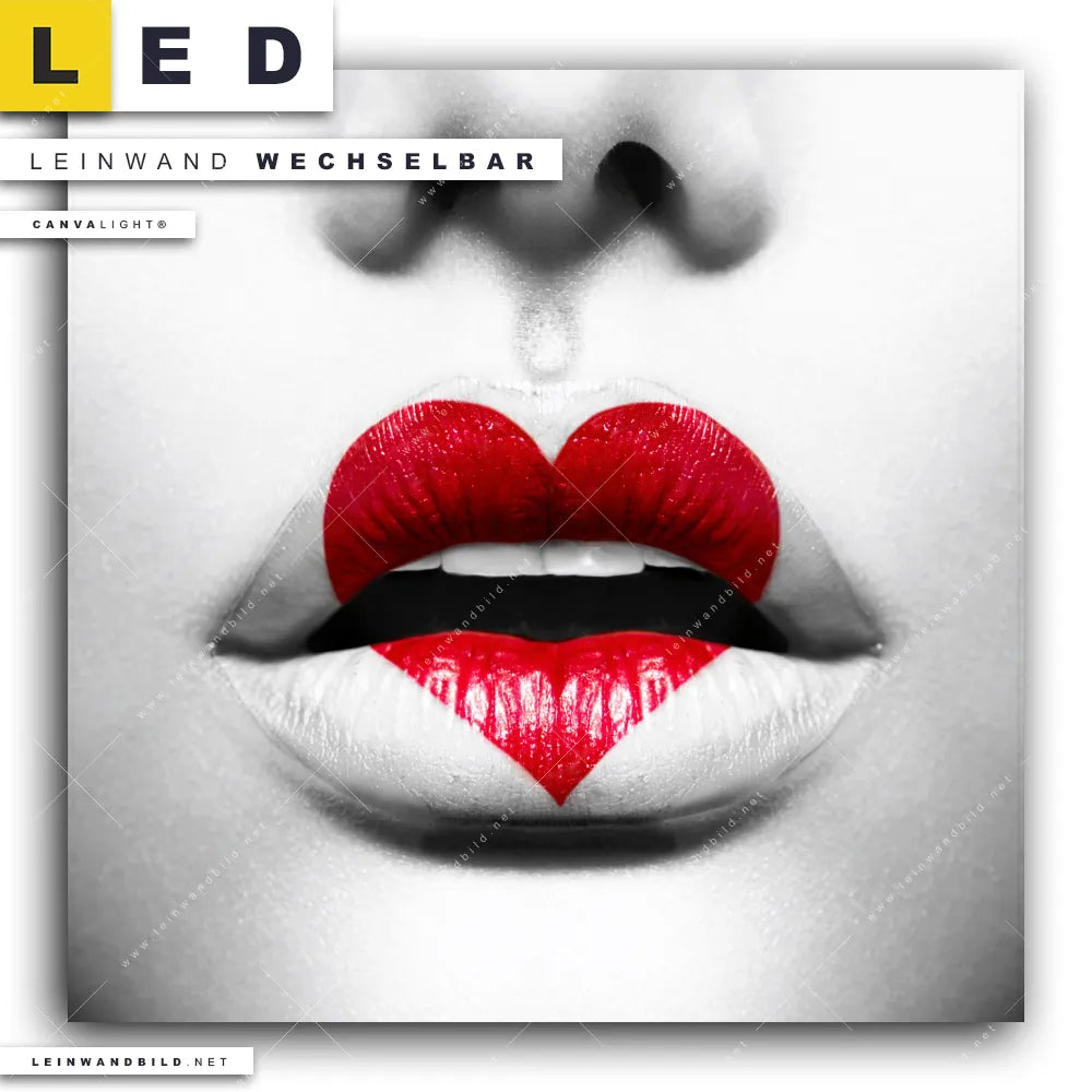 Dann sollte das LED Leinwandbild Canvalight® TEX | Herz-Mund | Quadrat den Weg zu Dir finden. Das stufenlos dimmbare Leinwandbild Herz auf den Lippen im steckerfertigen Leuchtrahmen mit Fernbedienung und optionaler Farbtemperatursteuerung fügt sich als Eye-Catcher harmonisch in jedes Bar - Gastronomie, Wohnzimmer - Schlafzimmer Raumkonzept ein.