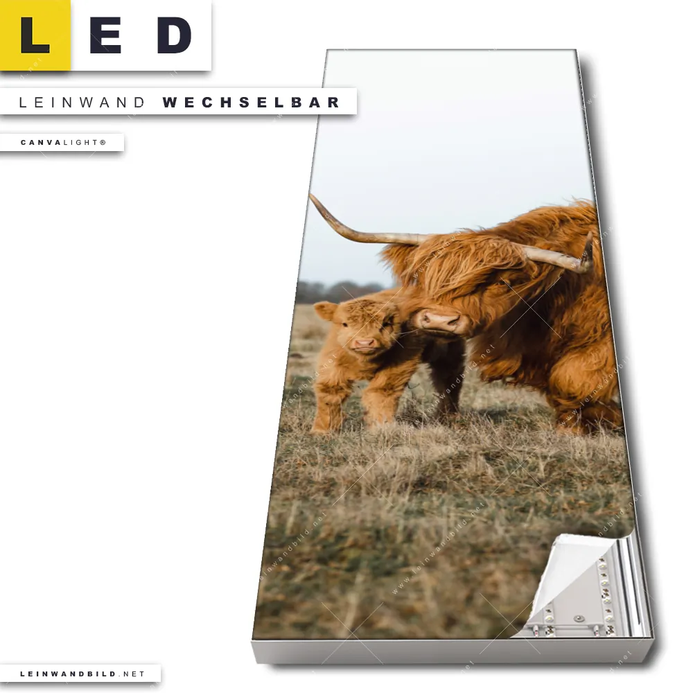 Du konfigurierst Dein individuelles LED Leinwandbild Canvalight® TEX | Highlander Familie | Schmal und wir produzieren es NEU für Dich. Unsere Tierwelt LED Bilder mit wechselbarer Textil-Leinwand sind KEINE Lagerware. Du bist Dir unsicher, welches Motiv oder Format das richtige für dein individuelles Canvalight® Leuchtbild ist, dann helfen wir dir gerne weiter und beraten dich!