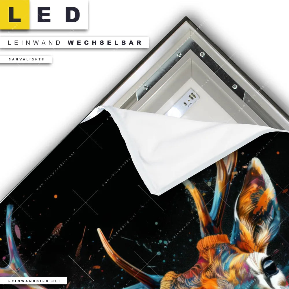 Du konfigurierst Dein individuelles LED Leinwandbild Canvalight® TEX | Hirsch-Kopf | Hochformat und wir produzieren es NEU für Dich. Unsere Tierwelt LED Bilder mit wechselbarer Textil-Leinwand sind KEINE Lagerware. Du bist Dir unsicher, welches Motiv oder Format das richtige für dein individuelles Canvalight® Leuchtbild ist, dann helfen wir dir gerne weiter und beraten dich!