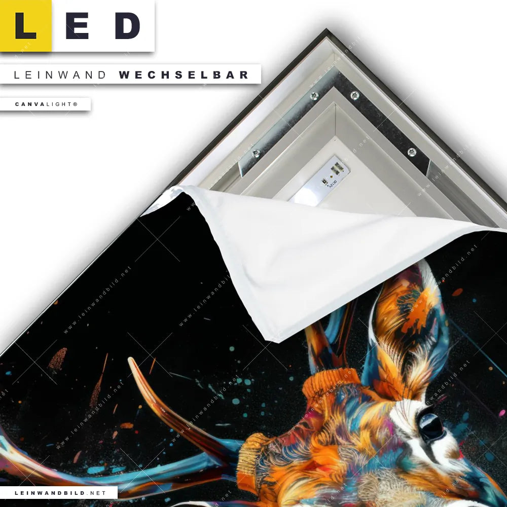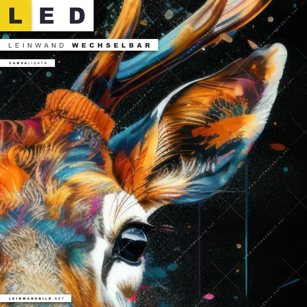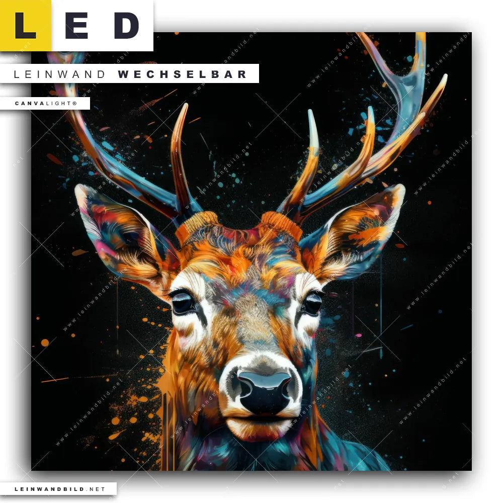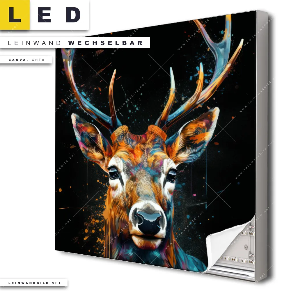 Du bist auf der Suche nach einem Tierwelt LED Leinwandbild im Quadratischen Format? Begriffe wie Hirsch, Natur, Rotwild, Wald, Farbspritzer, Farbexplosion haben Dich auf der Suche nach Deinem neuen XXL LED Wandbild mit wechselbarer Leinwand inspiriert? Farben wie Schwarz, Bunt dürfen auf Deinem neuen Leinwand-LED-Bild nicht fehlen und Leuchtbilder im Modern Art, Pop Art, Abstrakt Stil passen perfekt zu Deinem Einrichtungsstil?